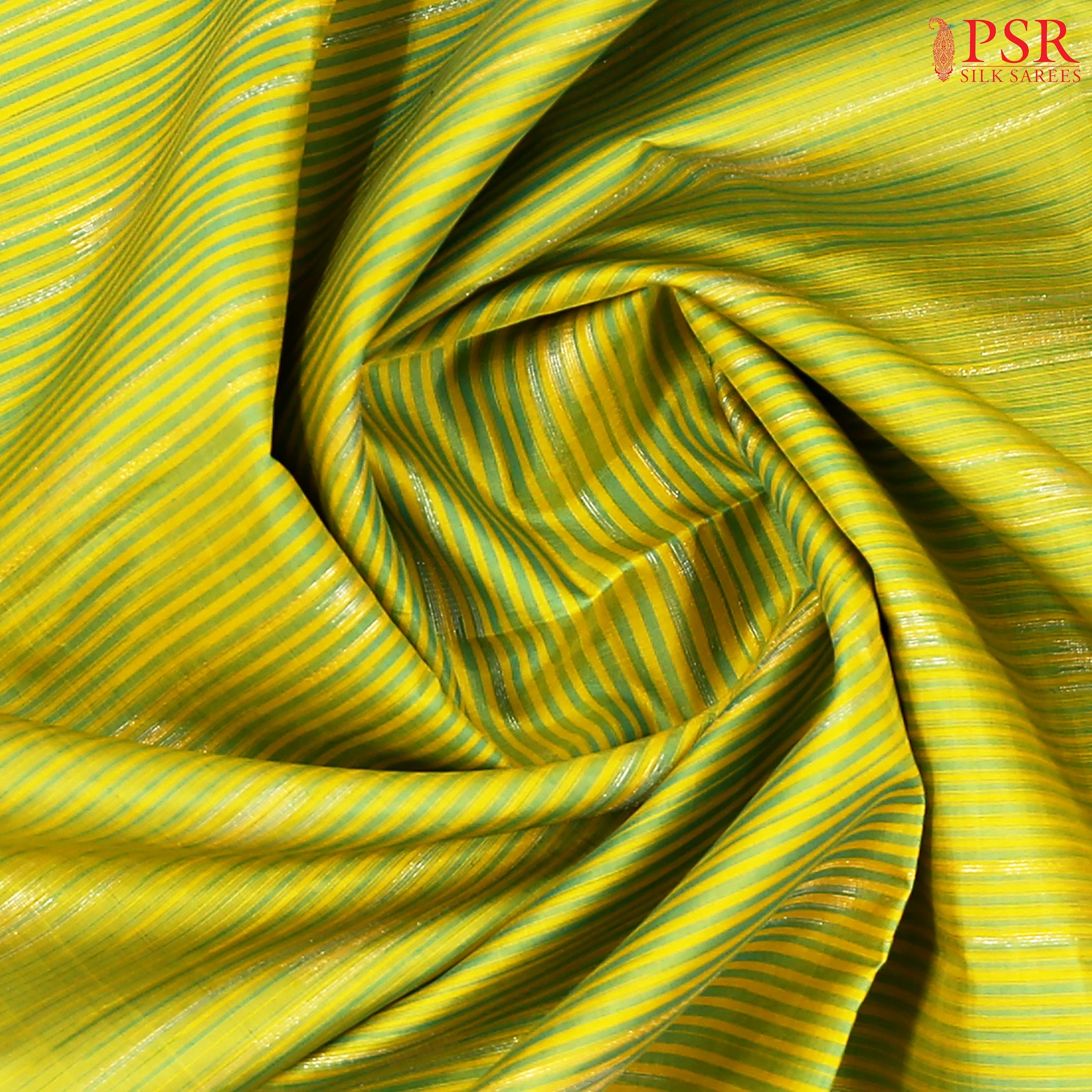 PSR Silk Sarees presents a vibrant Green & Yellow Soft Silk Saree, gracefully paired with a pleasing Tussar Beige contrast. This saree features an elegant double-colored stripes pattern enriched with delicate zari weaves, creating a perfect blend of modern style and traditional artistry. A contrasting Tussar Beige pallu with rich traditional zari work adds grandeur, while the plain Tussar Beige completes the ensemble with simplicity and charm. Ideal for festive occasions, weddings, and cultural celebrations, this saree reflects elegance in every fold.
