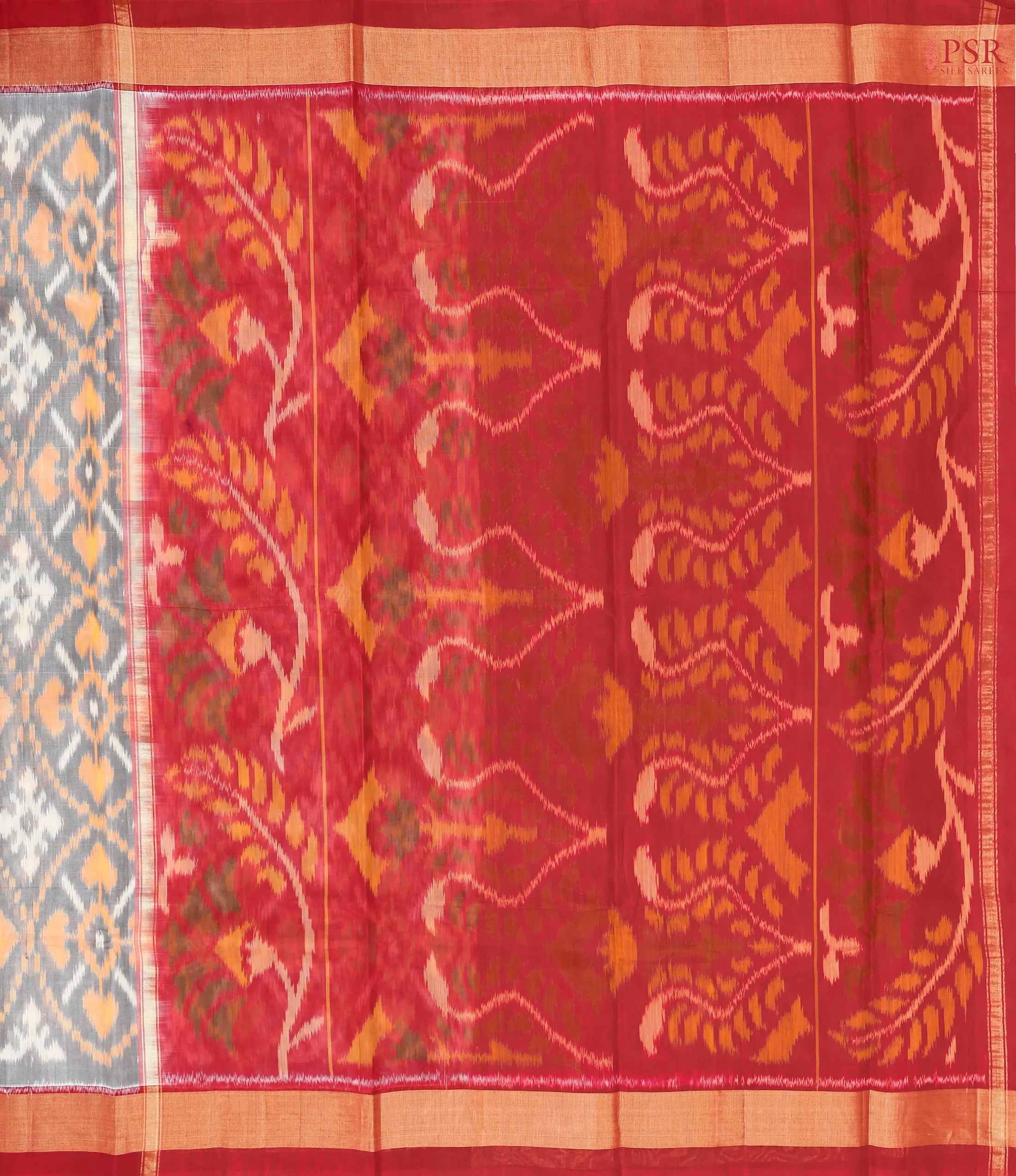 PSR Silks Presents: Grey & Barn Red Patola Pochampally Silk Cotton Saree ā A Fusion of Tradition & Elegance