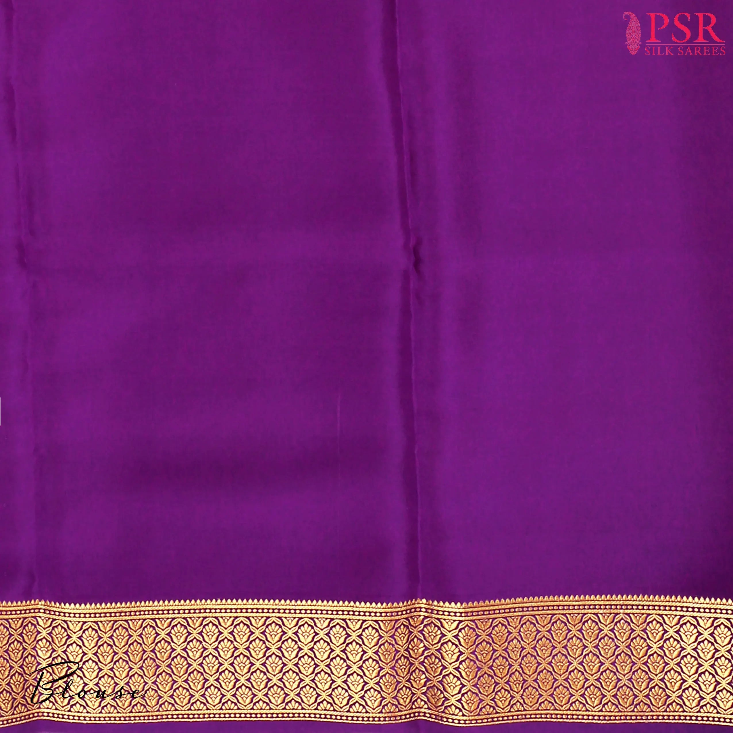 The saree features horizontal zari jacquard stripes, adding a subtle yet sophisticated texture. A Dark PurpleĀ pallu adorned with intricate zari work, along with a grand Dark Purple & Dark Pink traditional zari border, enhances its regal appeal. Completing the ensemble is a plain Dark Purple blouse, balancing elegance with classic charm.