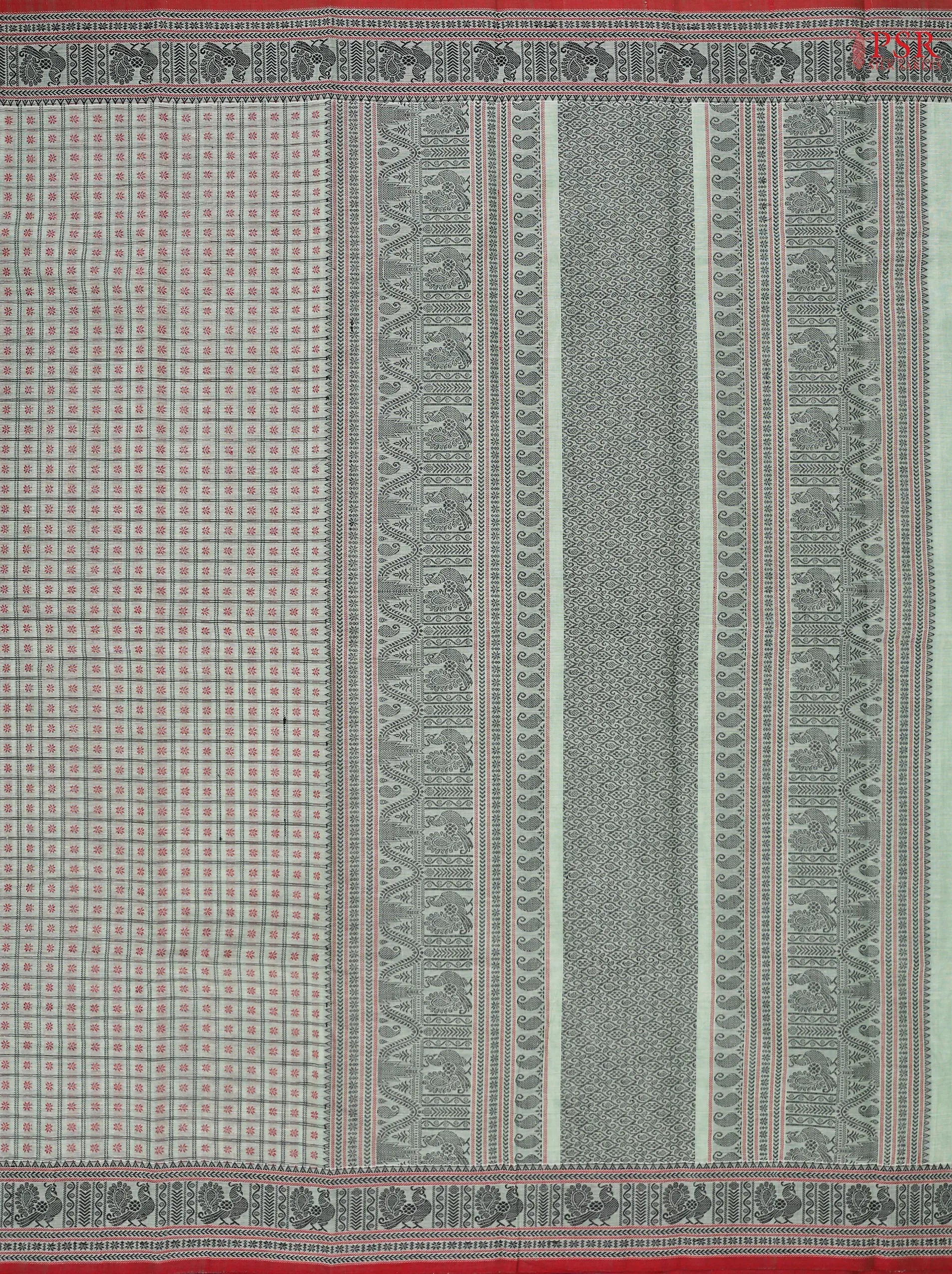 PSR Silks presents a traditional handloom Kalakshetra Kovai Cotton saree in a captivating Laurel Green, beautifully weaved Black & Red thread work.