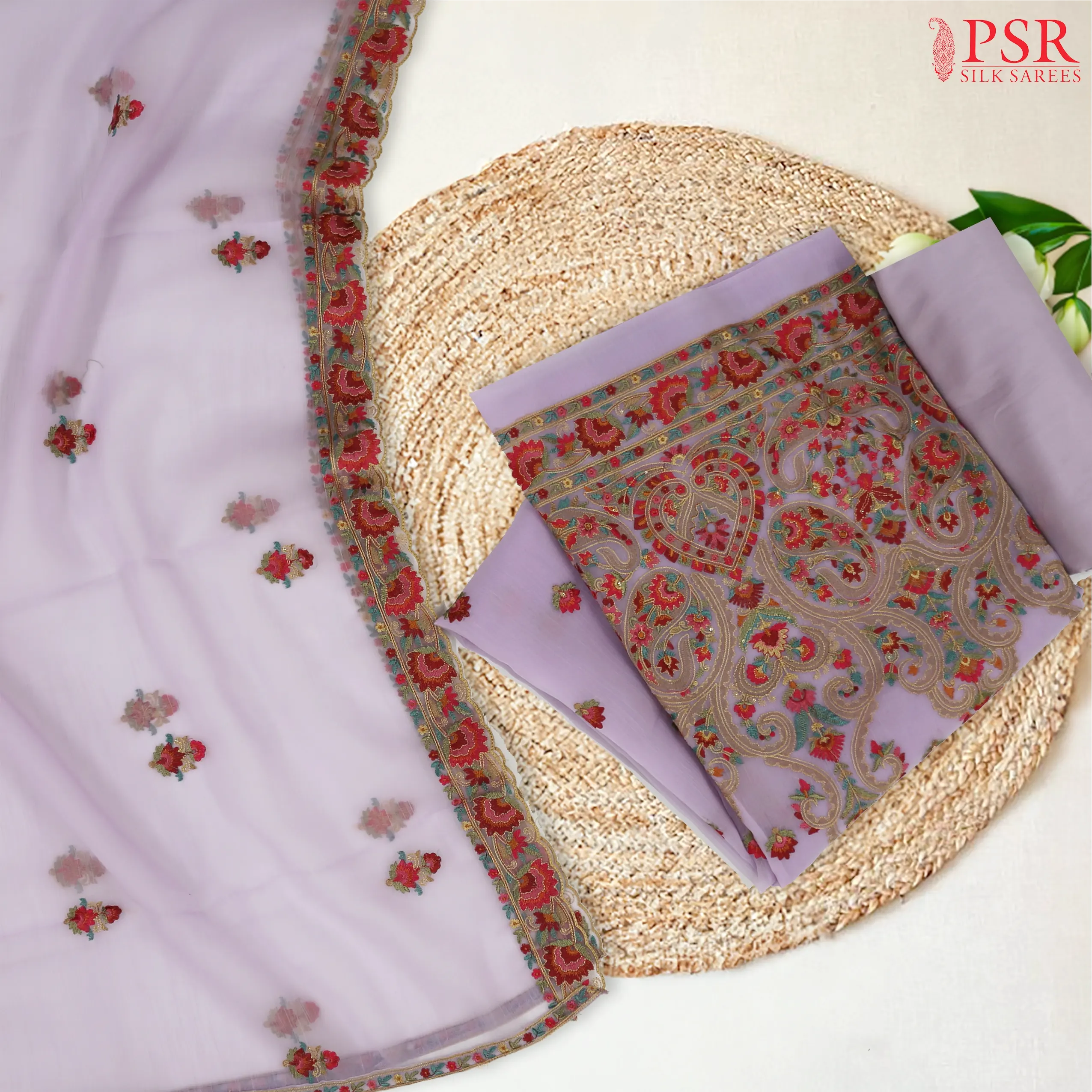 PSR Silk Sarees presents a Lavender colored Organza dress material.