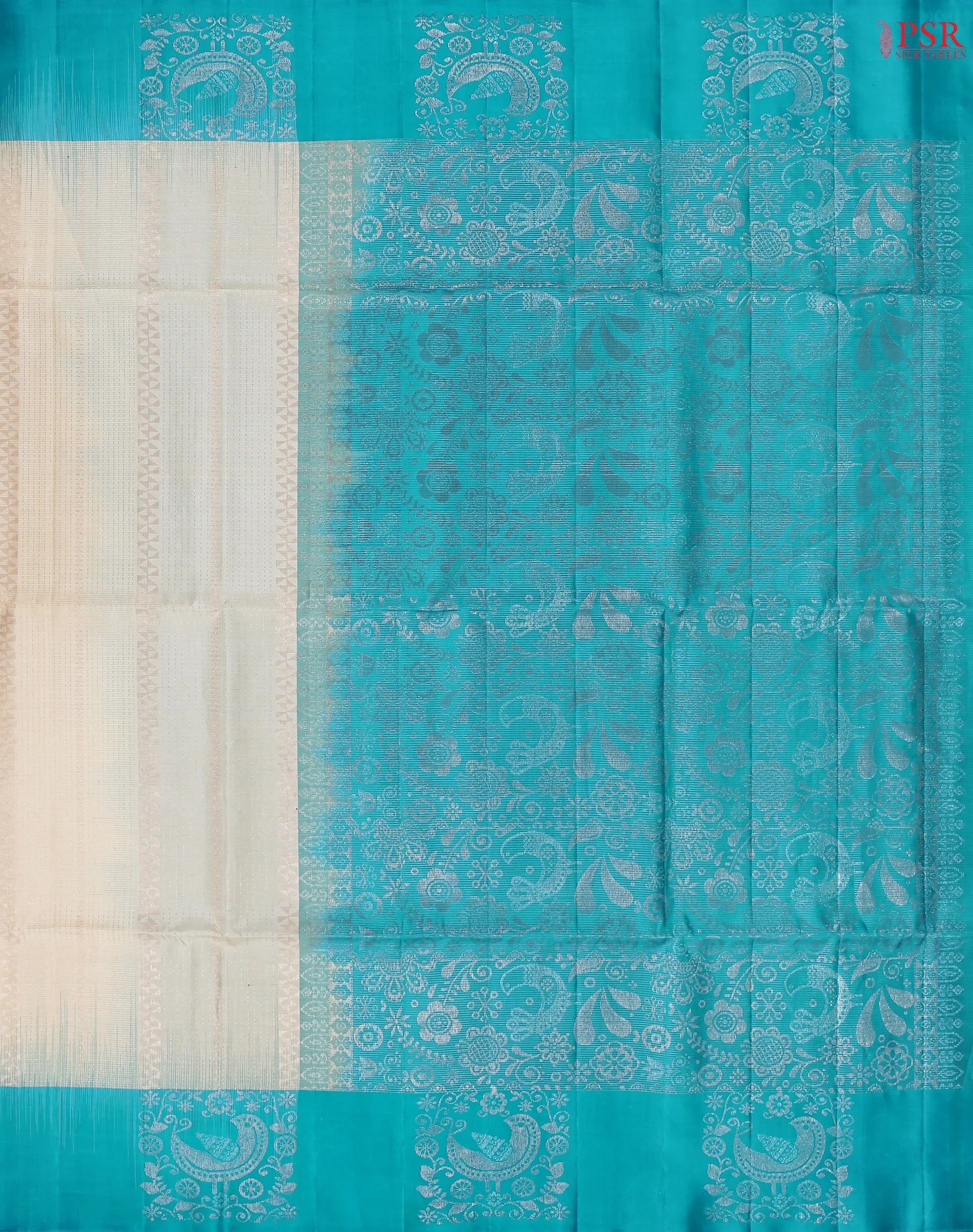Light Beige & Turquoise Cyan Soft Silk Saree with Silver Zari Stripes – PSR Silk Sarees