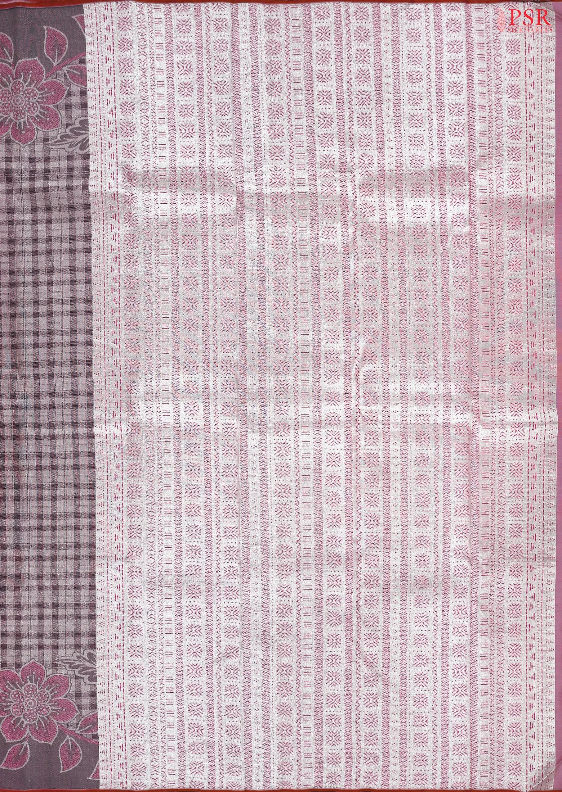 The saree features delightful and plaids weaves, beautifully blending artistry with luxury. It is adorned with a Pinkcolored designer jacquard work pallu and designer floral border enriched with matching abstract motifs, adding a refined contemporary touch. Completing the ensemble is a Pink colored blouse with zari jacquard weaves, perfectly complementing the saree’s designer appeal.