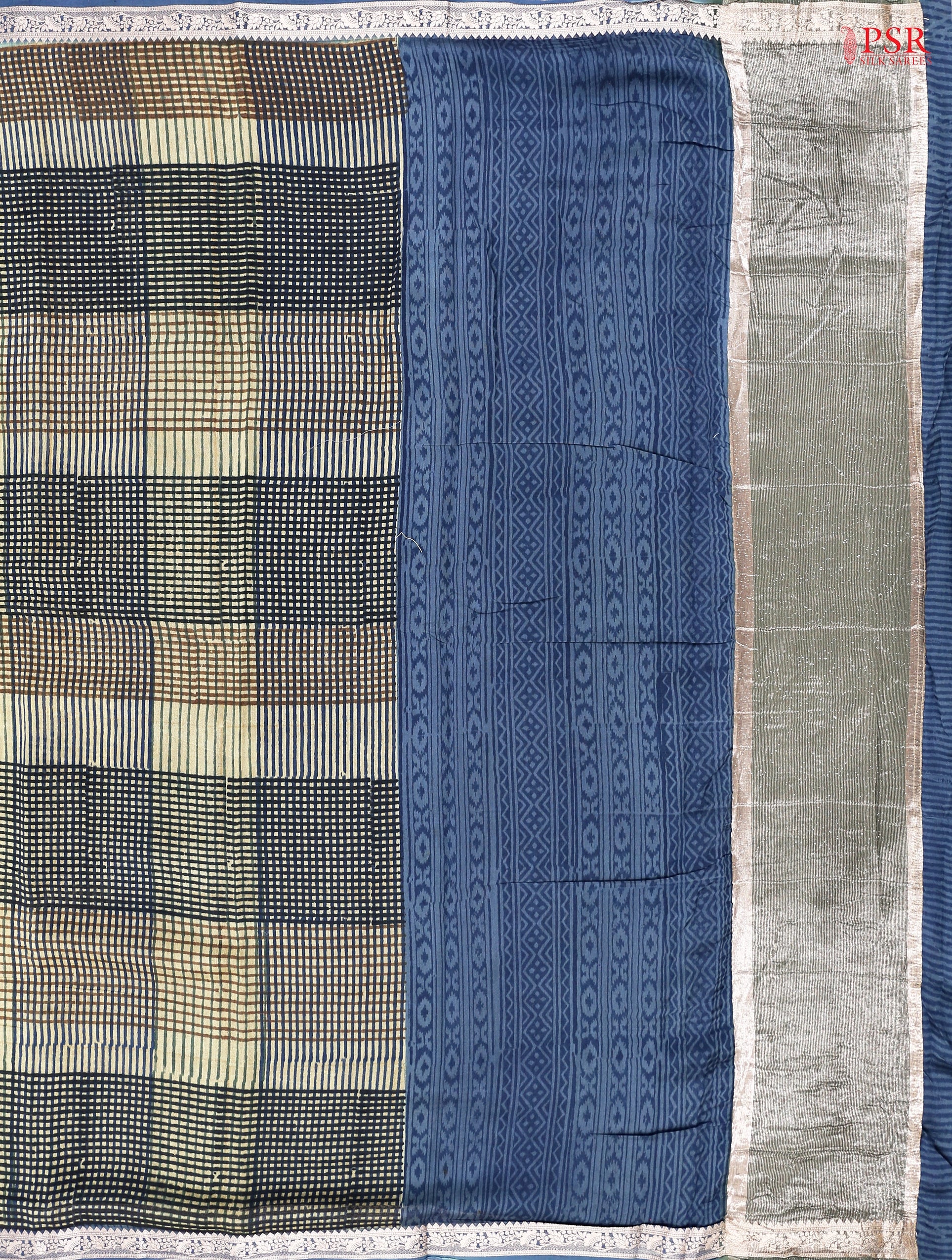 PSR Silk Sarees presents a Light Olive colored Chanderi Silk Cotton saree with combination of Steel Blue color.