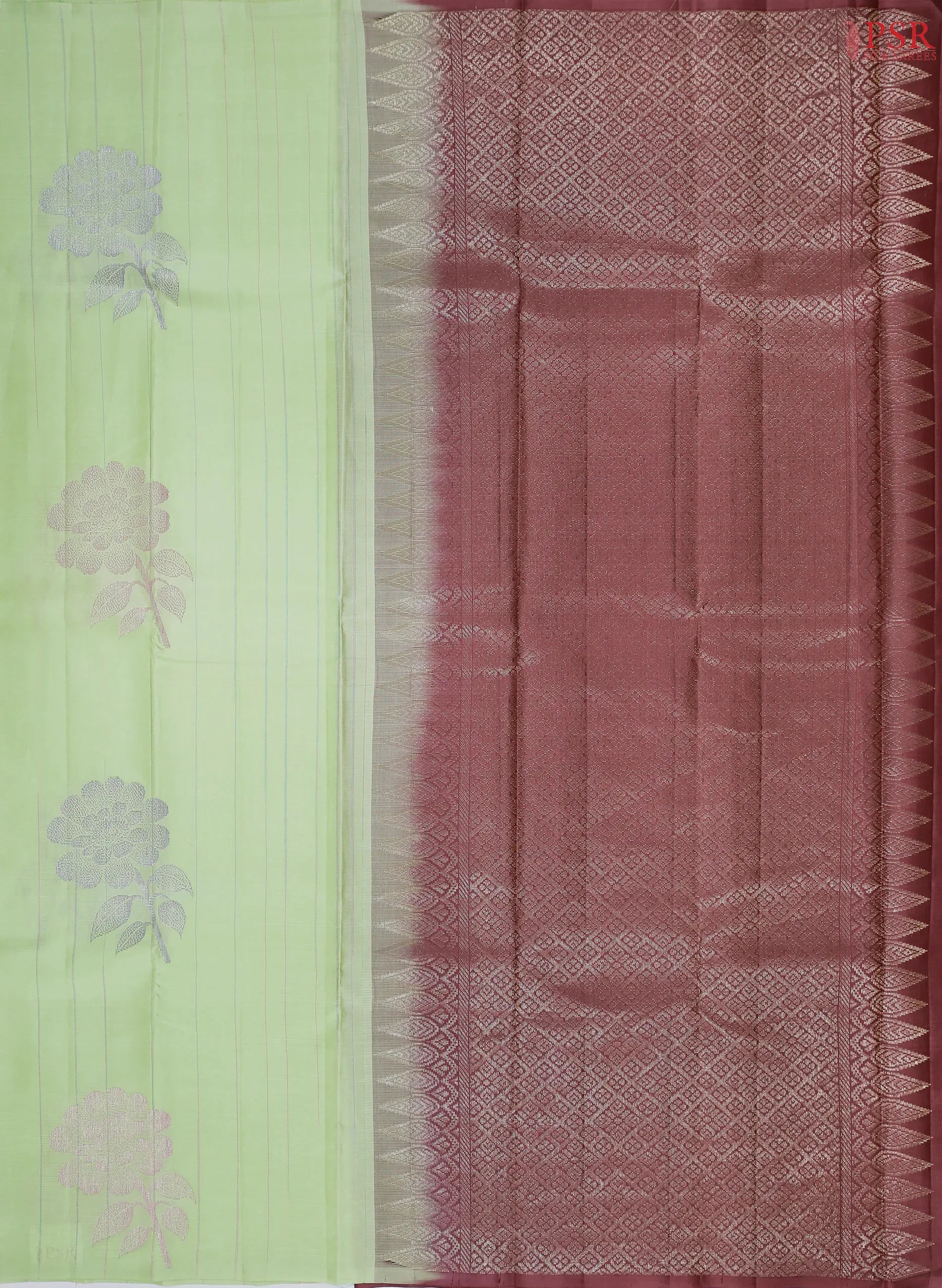 PSR Silk Sarees presents a Light Pistachio  Kanchipuram Silk saree paired with a rich Rosewood combination, offering a perfect blend of tradition and artistic elegance.