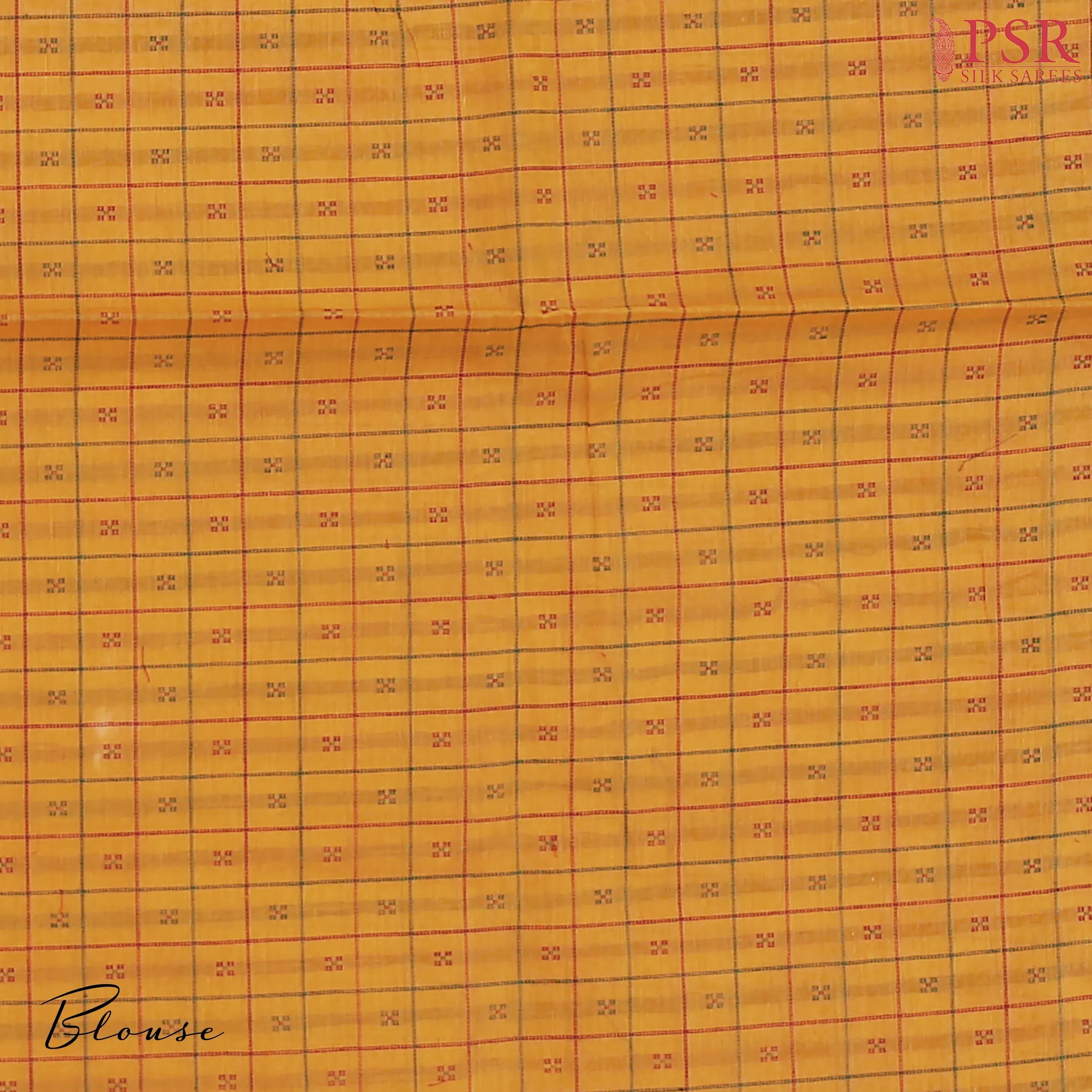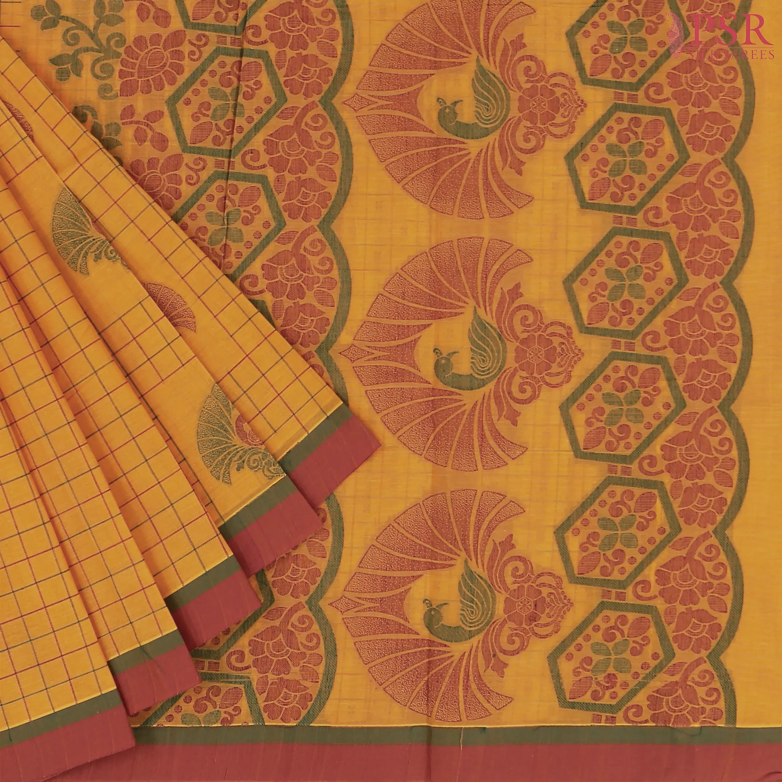 PSR Silks presents a traditional handloom Kovai Cotton saree in a captivating Marigold, beautifully weaved with green & maroon thread work.