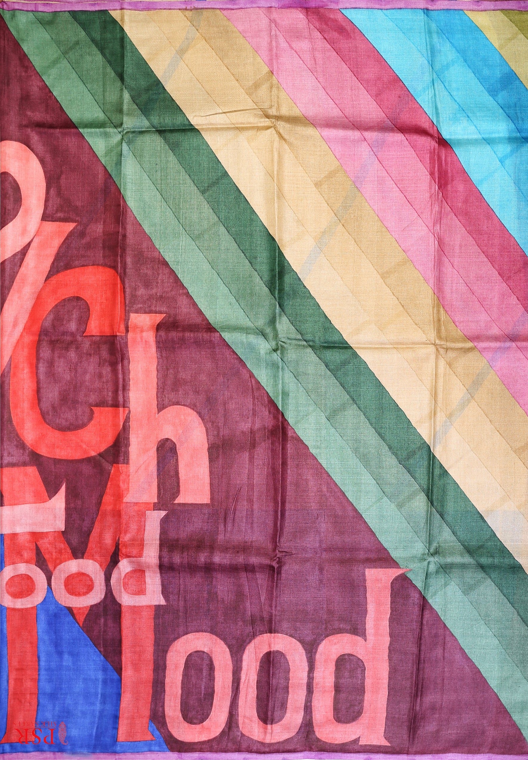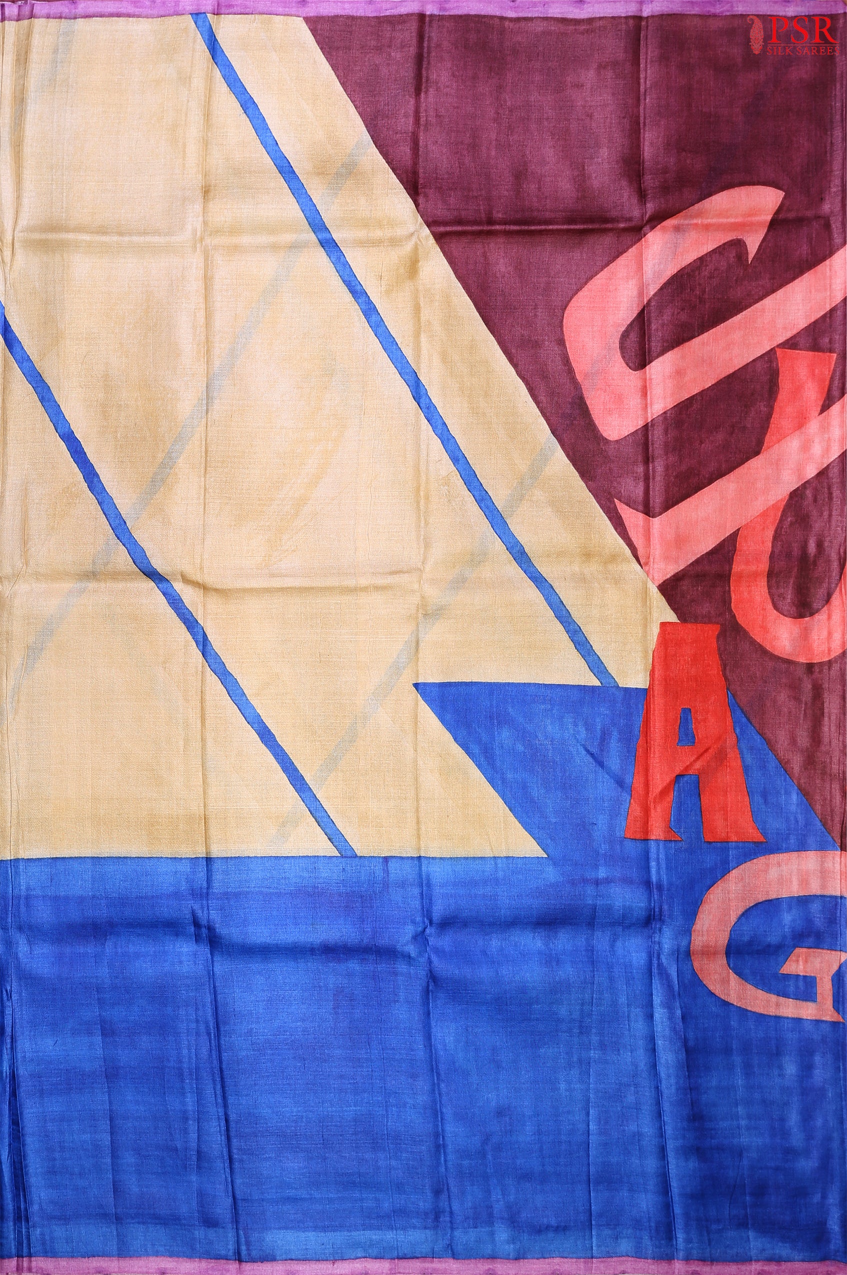 PSR Silks presents a stunning beige based multicolored Kadhi Tussar Silk saree, beautifully harmonized with a rich dark burgundy hue. This exquisite saree showcases a captivating blend of alphabet motifs and diagonal stripes, creating a truly unique design. The pièce de résistance is the vibrant, colorful diagonal striped pallu that adds a pop of color and elegance. Paired with a sleek plain dark burgundy blouse, this saree is a perfect choice for those who seek both sophistication and a dash of playfulness in their wardrobe.