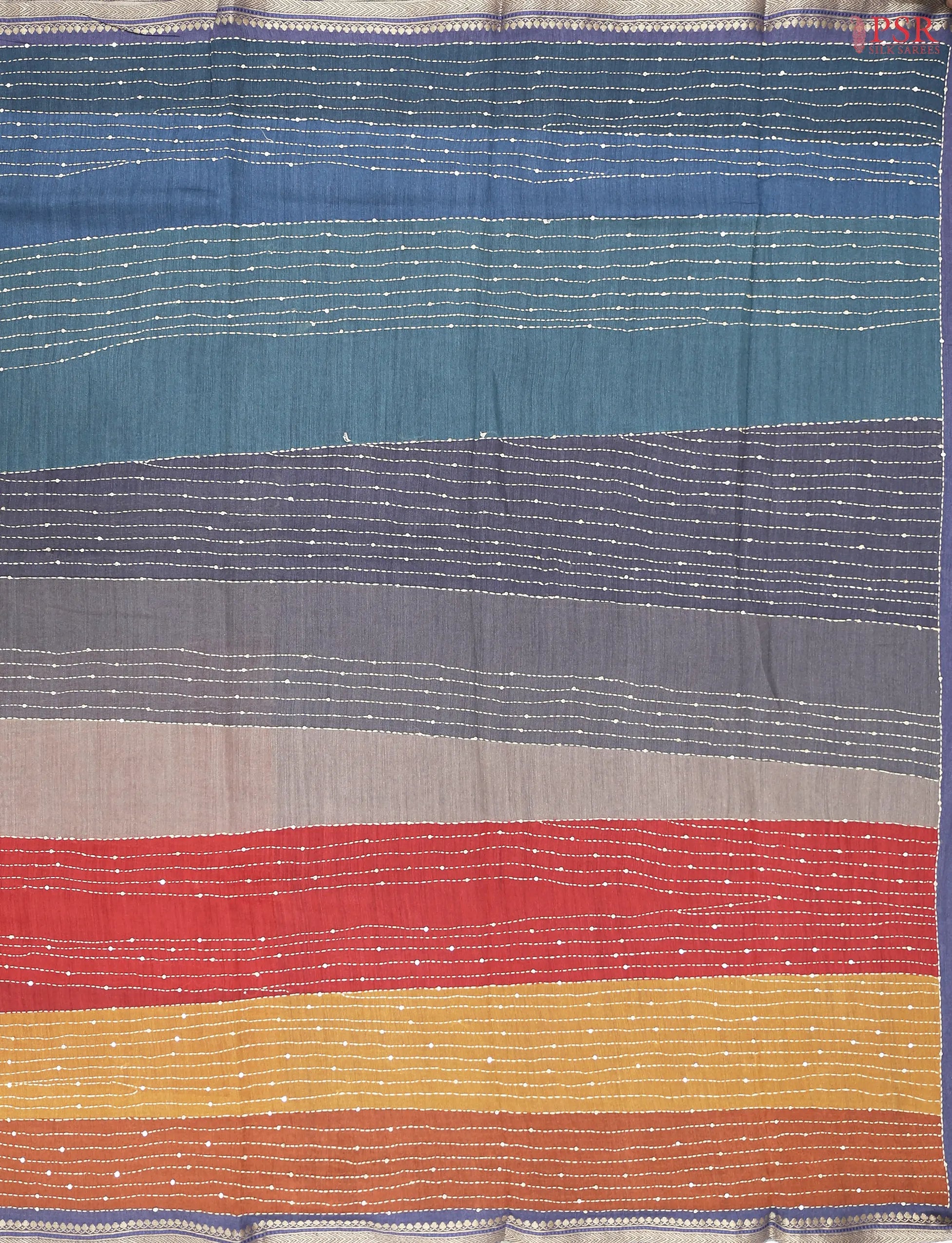 The saree features a multicolor striped pattern beautifully embellished with Kantha and sequin embroidery work, creating a stunning fusion of texture and color. It is complemented by a matching pallu, enhancing its artistic charm. Completing the look is a plain Blue Lilac blouse adorned with a small zari border, adding a subtle touch of sophistication.