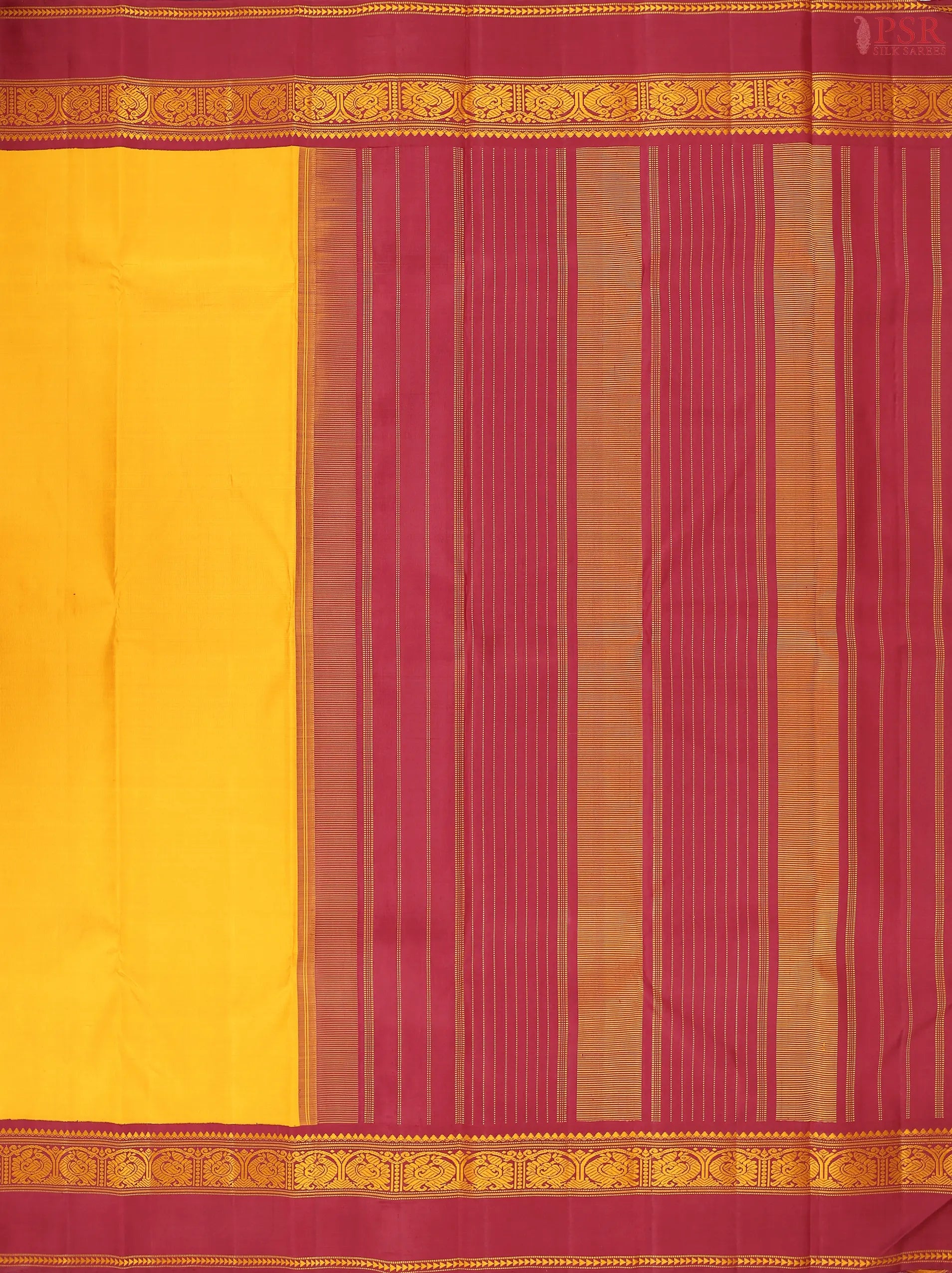 PSR Silk Sarees presents a Mustard Yellow Kanchipuram Silk Saree paired with a classic Maroon combination, reflecting timeless elegance and traditional grace.