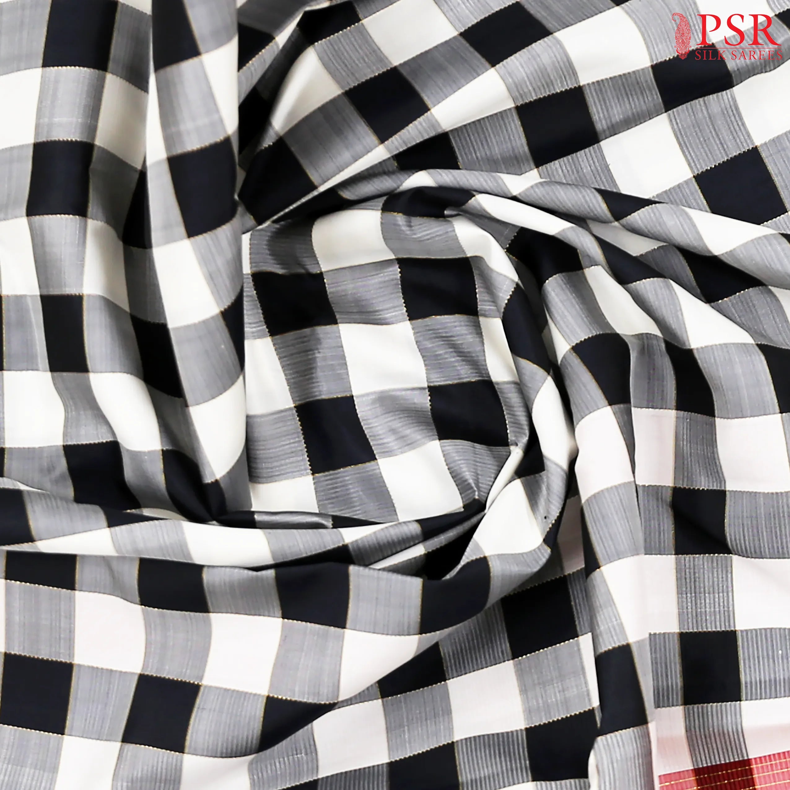 PSR Silk Sarees presents a classic Off White & Black Kanchipuram Silk Saree with a striking Crimson Red combination, designed for timeless elegance and modern sophistication.