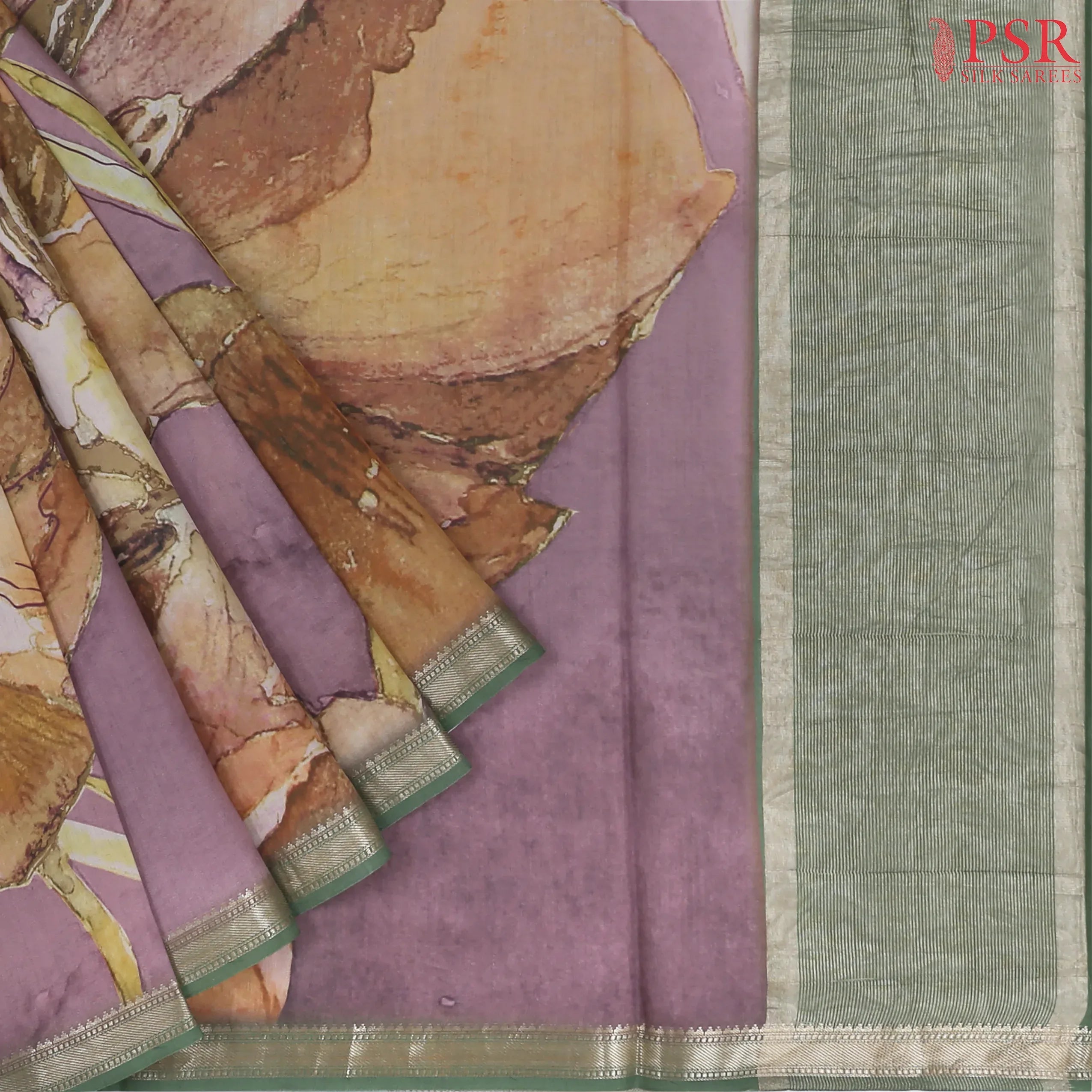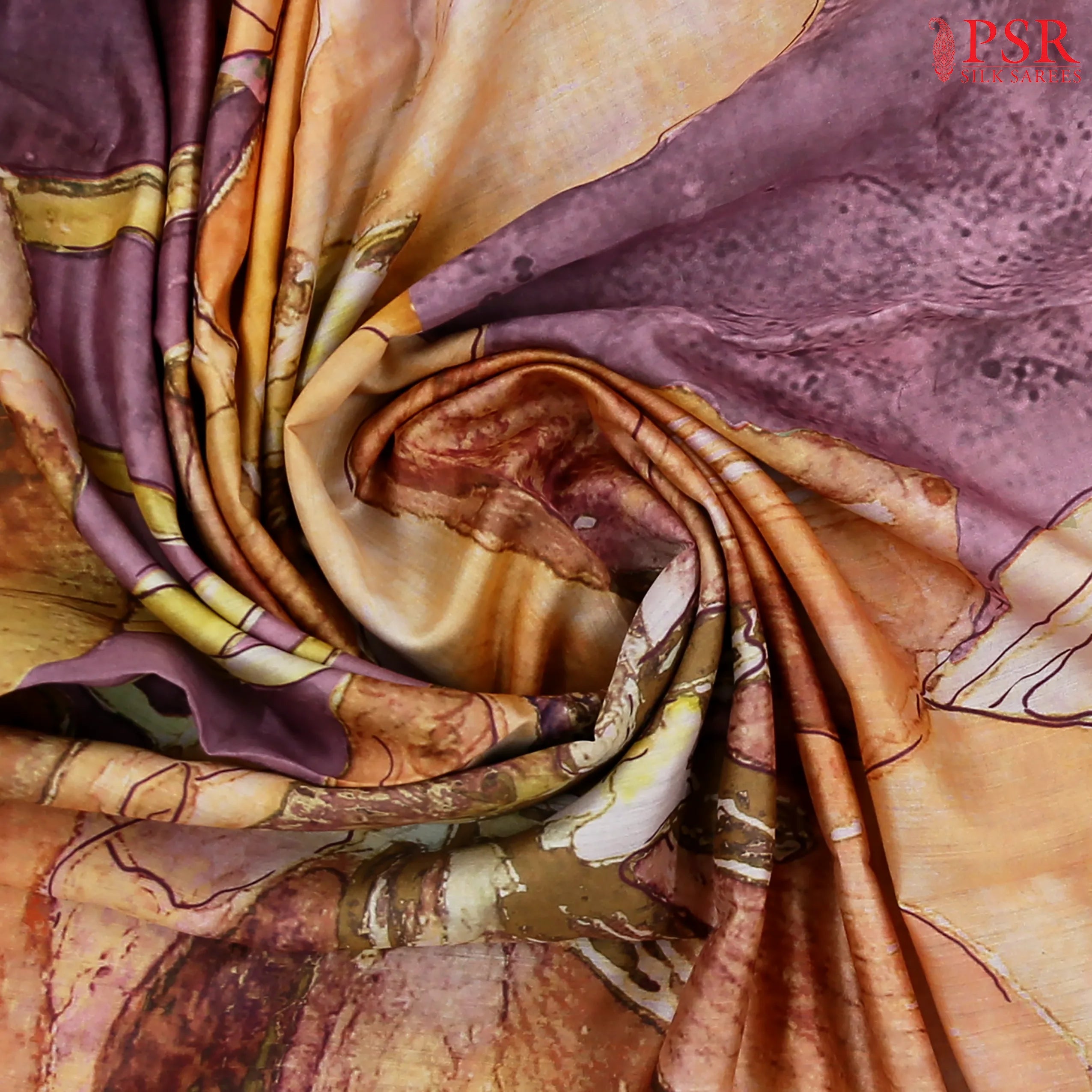 Embark on a journey of grace and sophistication with PSR Silks' Orchid Purple & Orange Chiniya Silk saree. This exquisite saree features stunning artistic contemporary floral prints, creating a visual masterpiece that reflects both tradition and contemporary elegance.