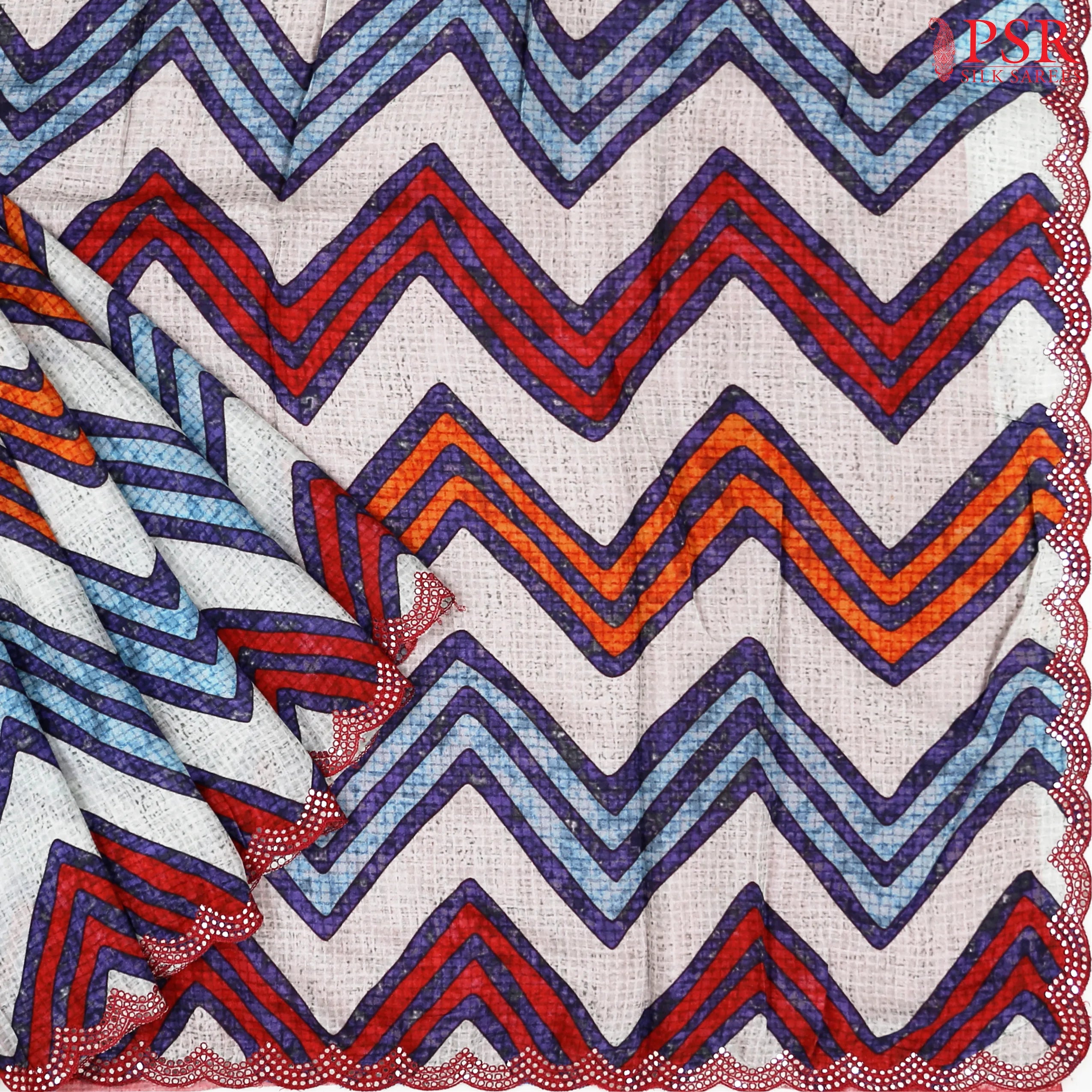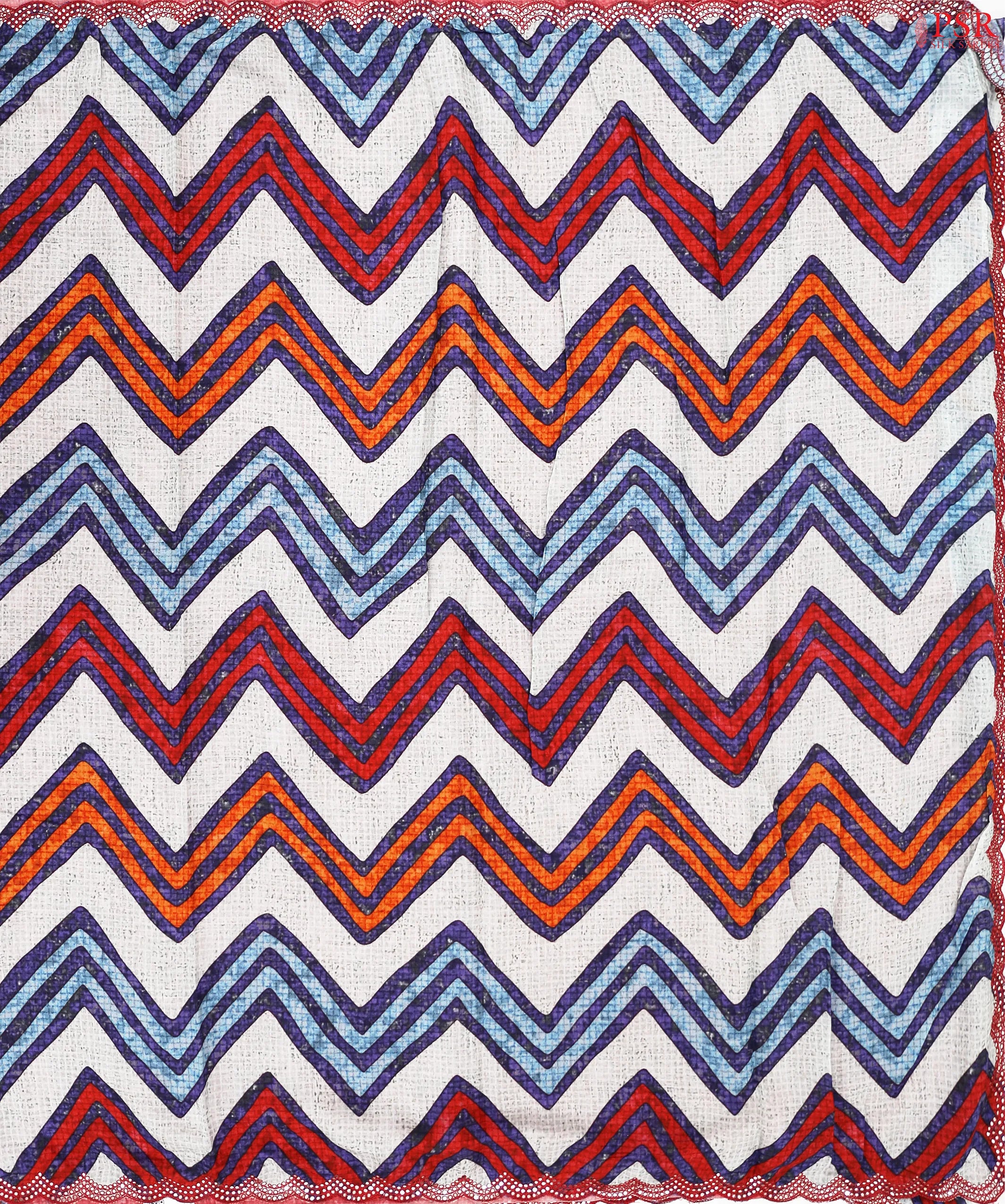 This beautiful features an elegant & coloruful chevron pronts with self checks, adding a touch of refined shimmer. Subtle hints of blue hues enhance its visual appeal, creating a unique and pleasing color harmony.