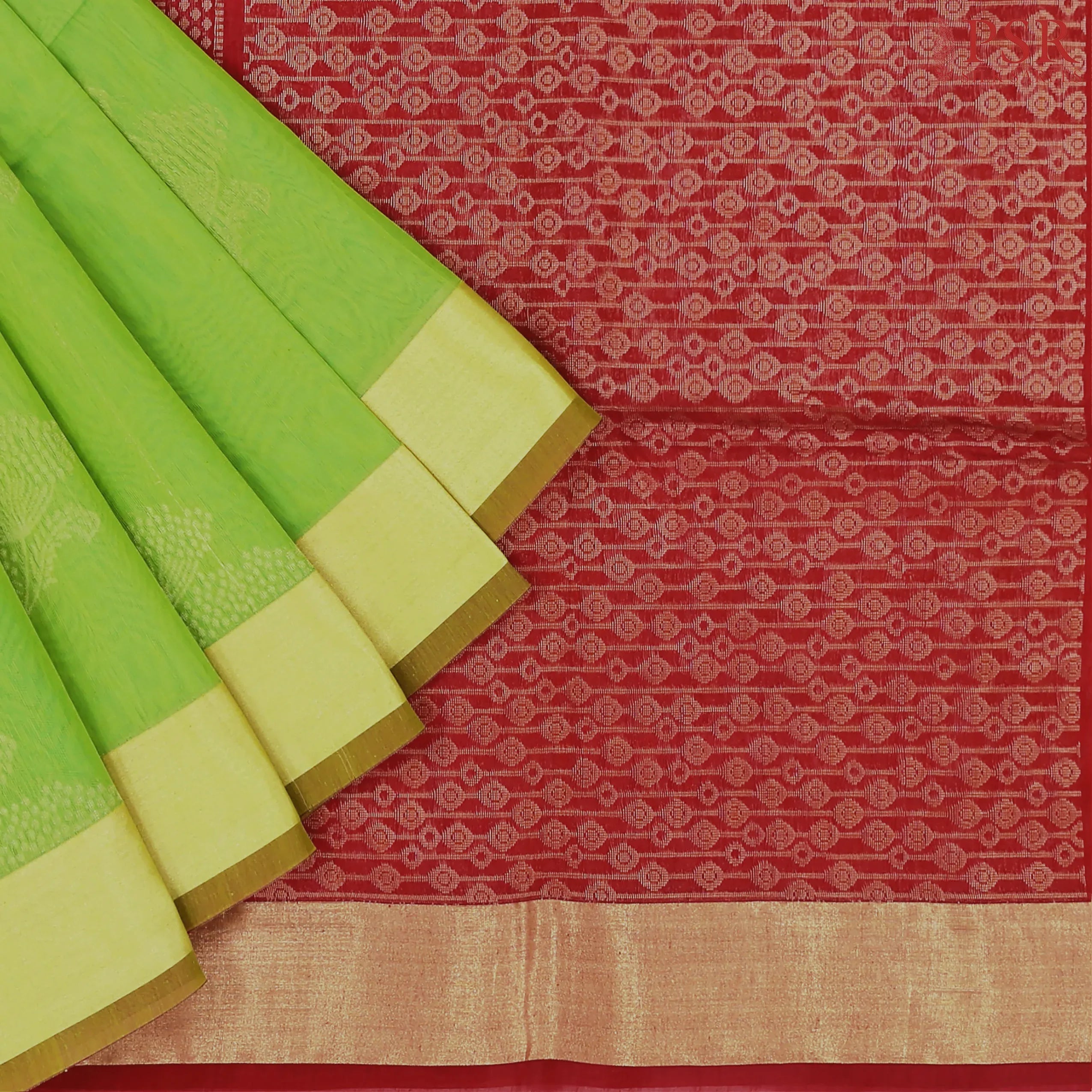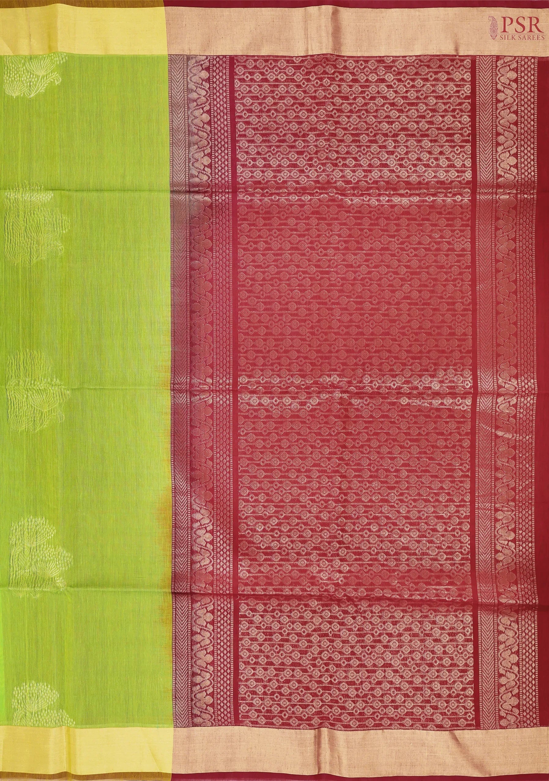 PSR Silk Sarees presents a Parrot Green colored Silk Cotton saree with combination of Maroon color.