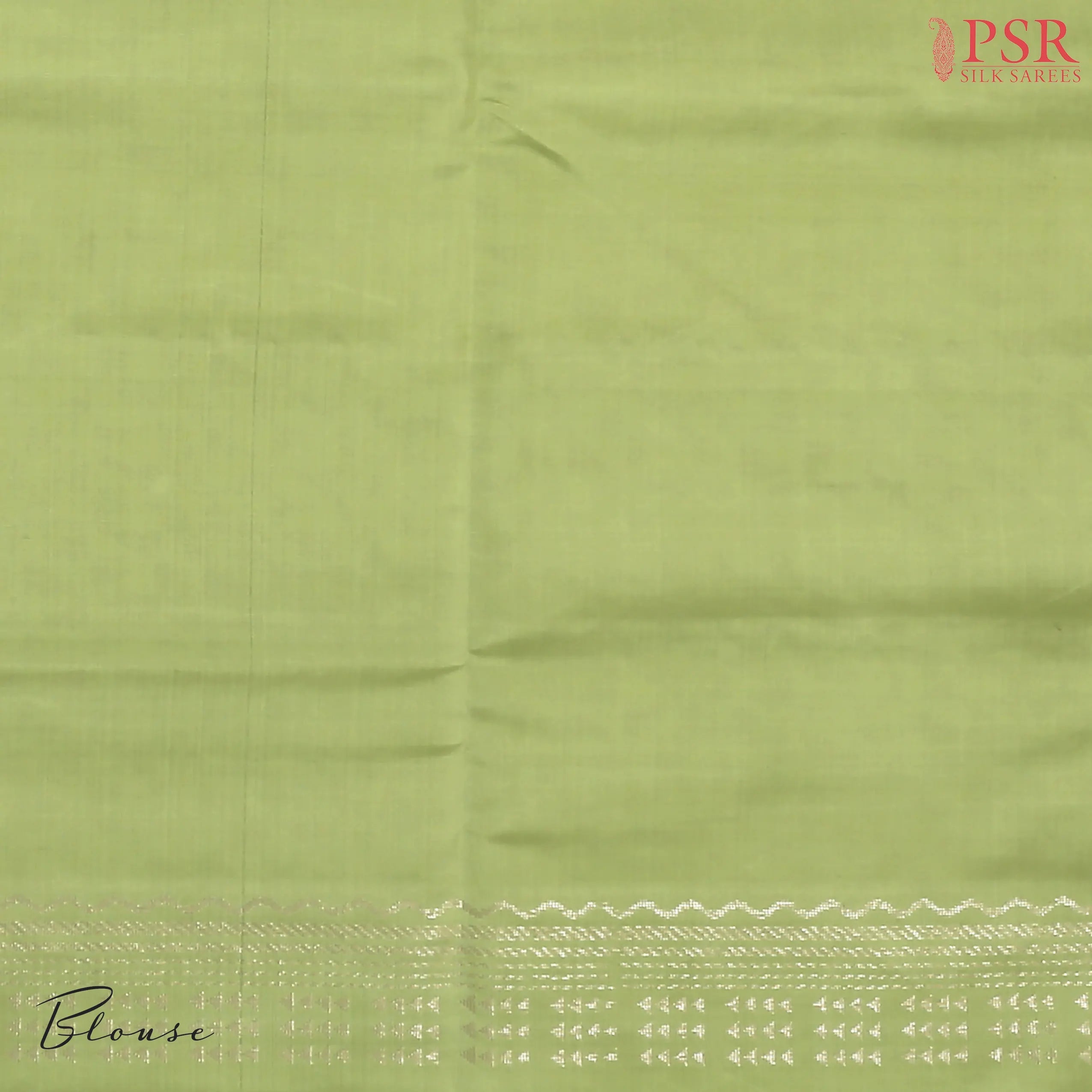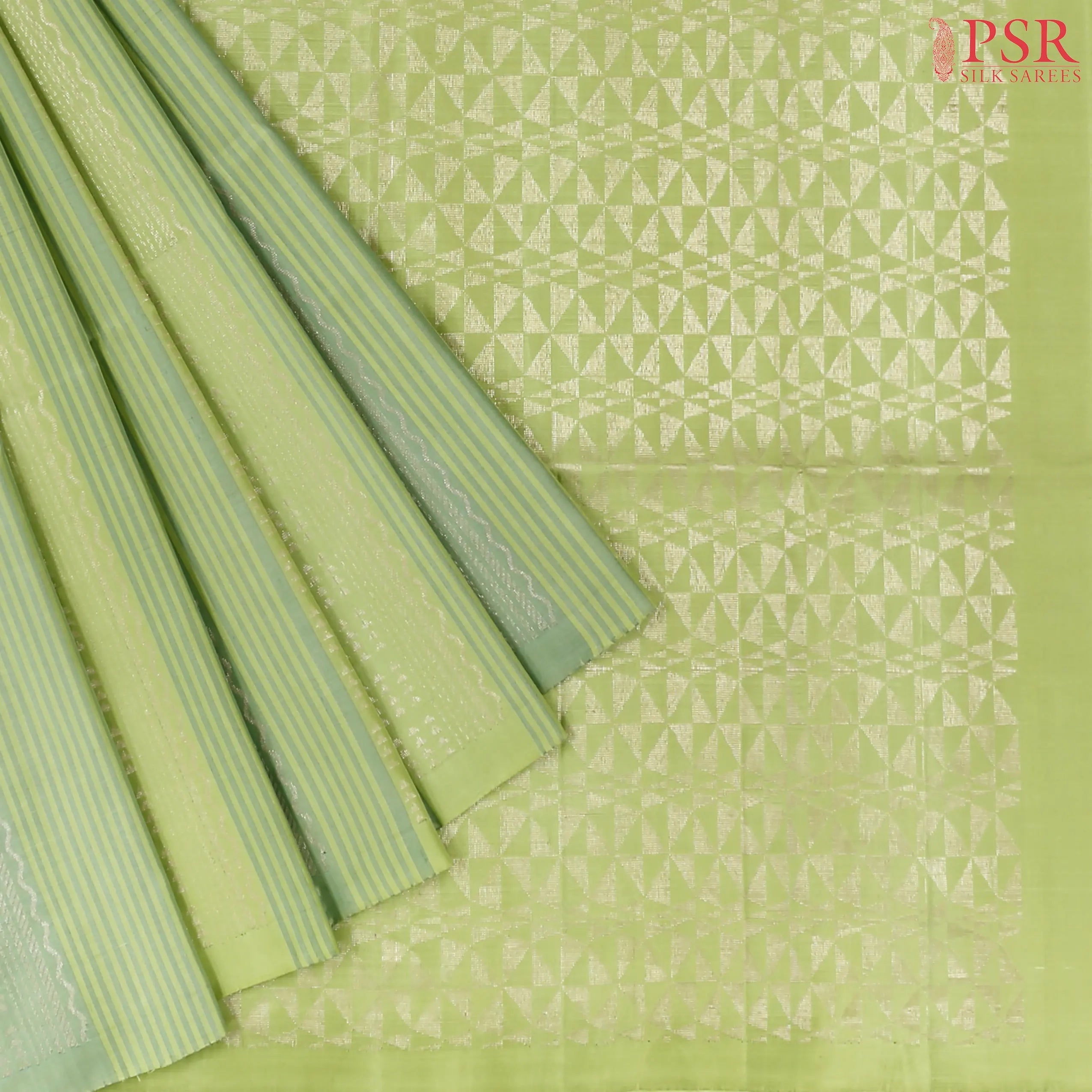 PSR Silk Sarees presents a charming Pastel Green Soft Silk Saree. This stylish borderless drape features an elegant double-colored stripes pattern enriched with floral zari jacquard work, creating a perfect blend of modern style and traditional artistry. Pallu with rich traditional zari work adds grandeur, while the plain matching blouse completes the ensemble with simplicity and charm. Ideal for festive occasions, weddings, and cultural celebrations, this saree reflects elegance in every fold.