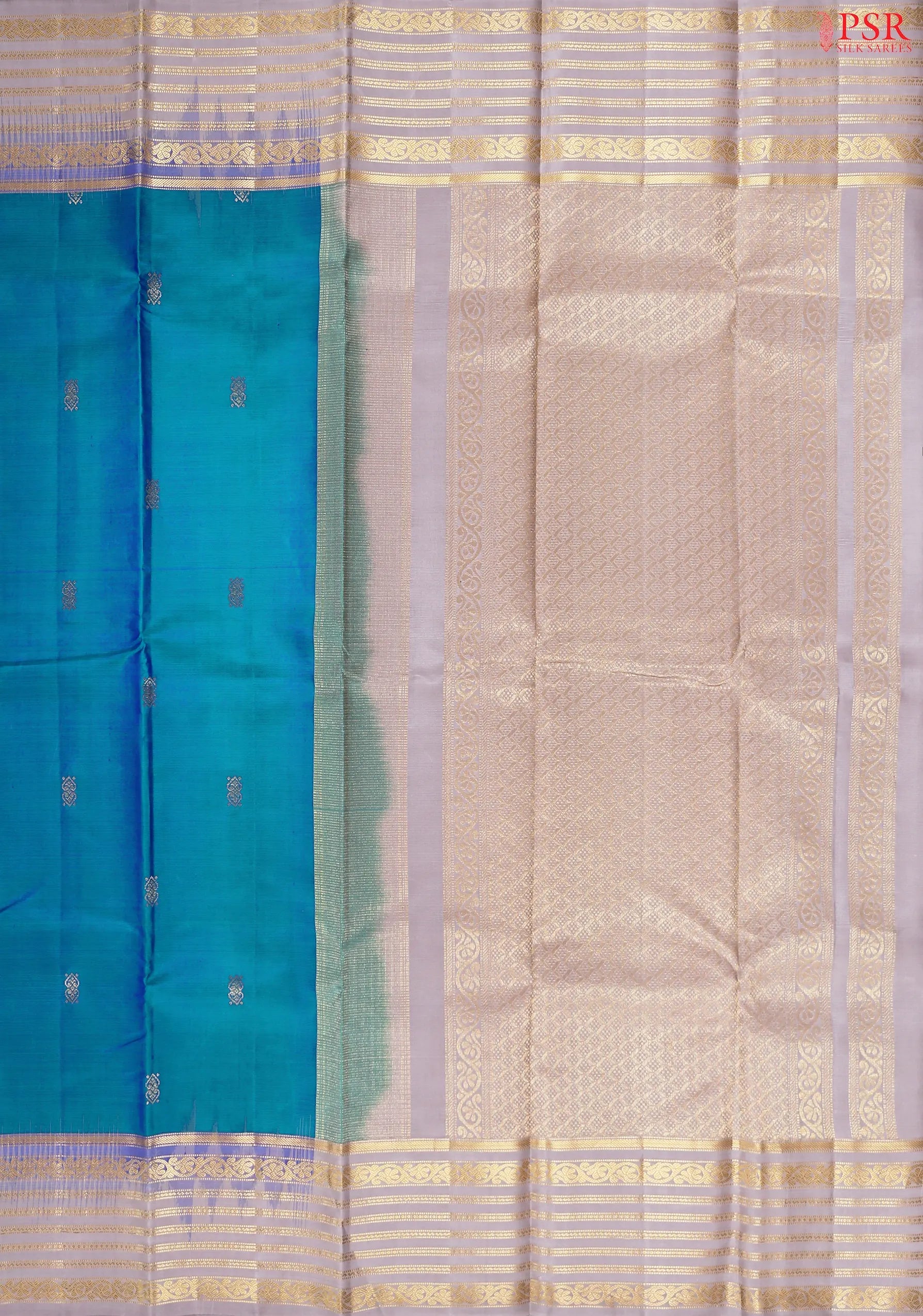 PSR Silk Sarees presents a Peacock Blue colored Fancy Kanchipuram Silk with contrasting combination of Mauve Grey color.