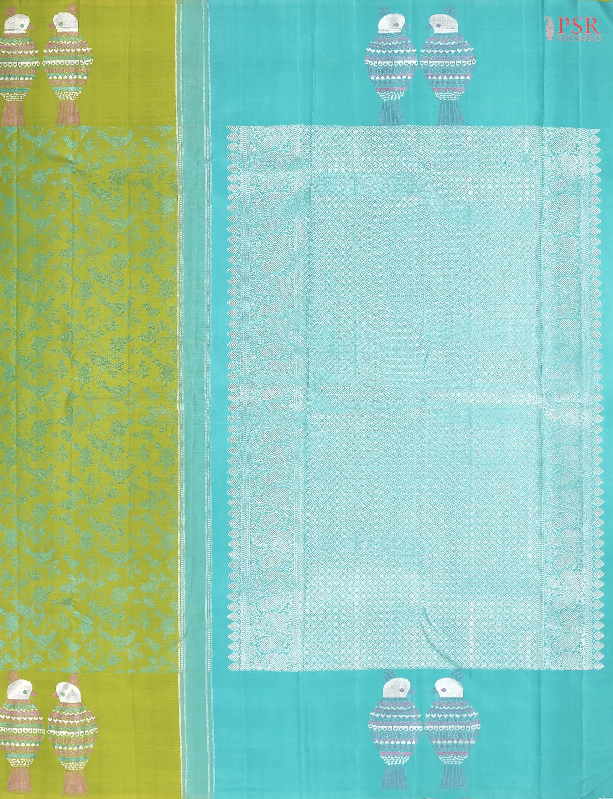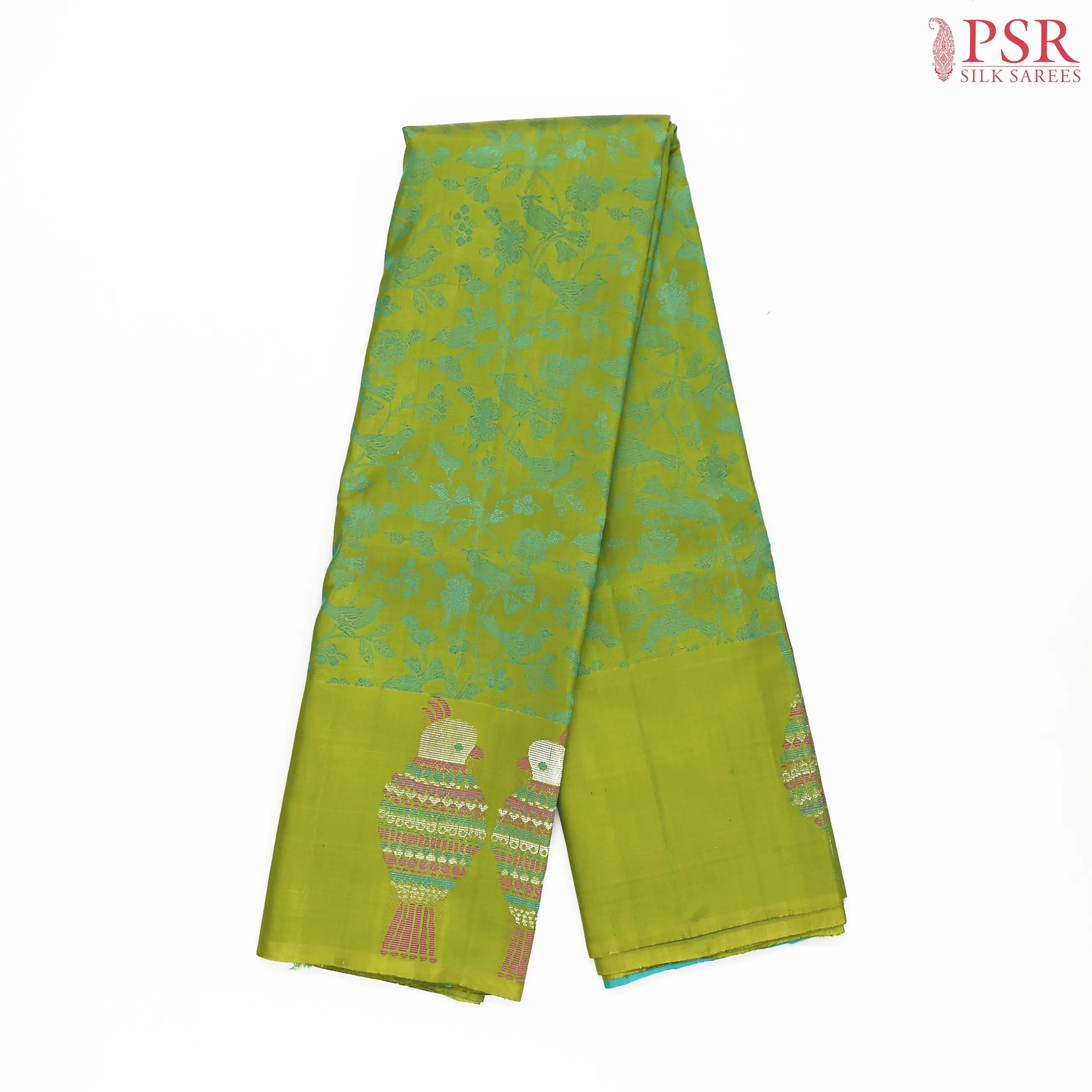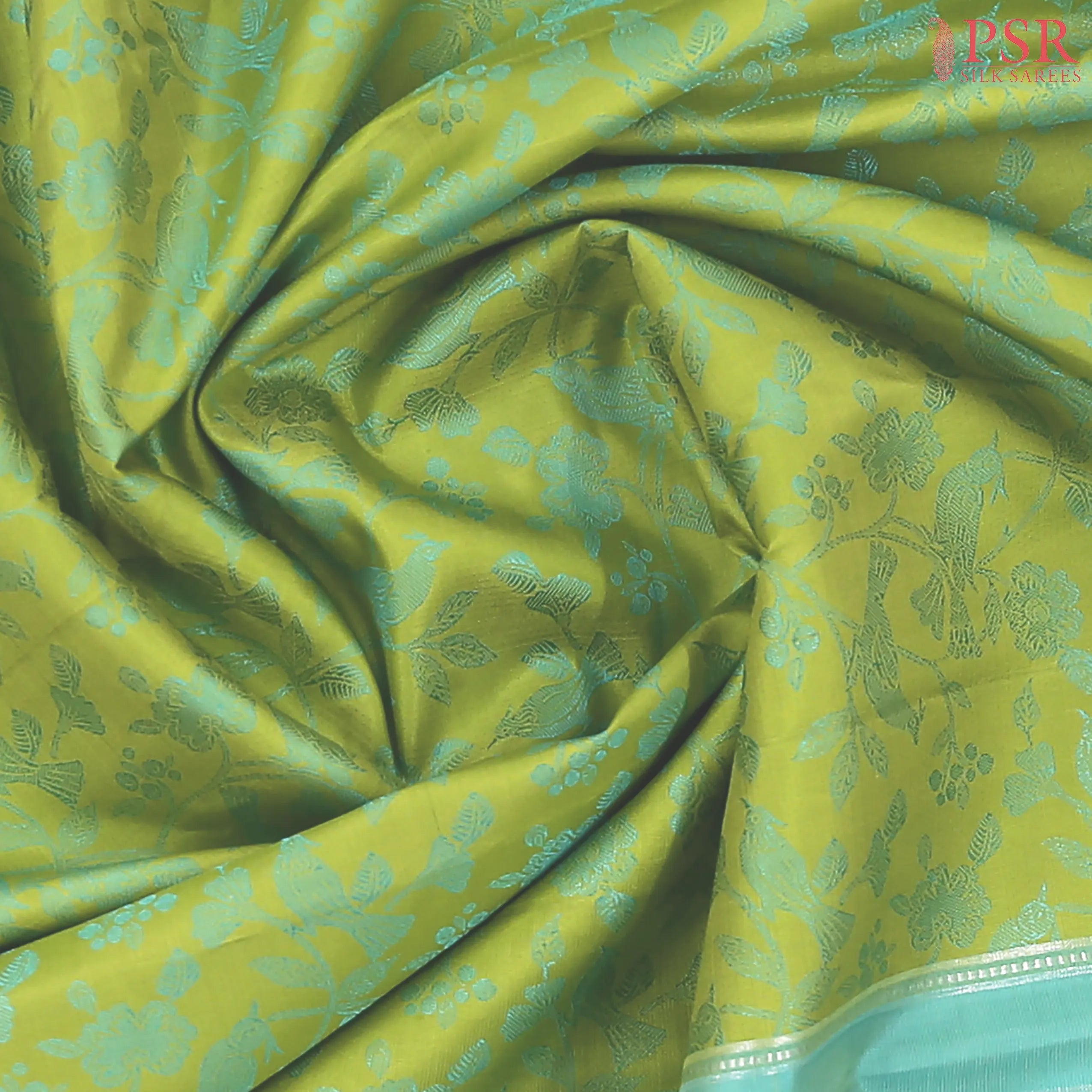 PSR Silk Sarees presents a Pear Green Kanchipuram Silk saree, beautifully paired with a graceful Turquoise Blue combination, designed to reflect refined elegance and artistic craftsmanship.