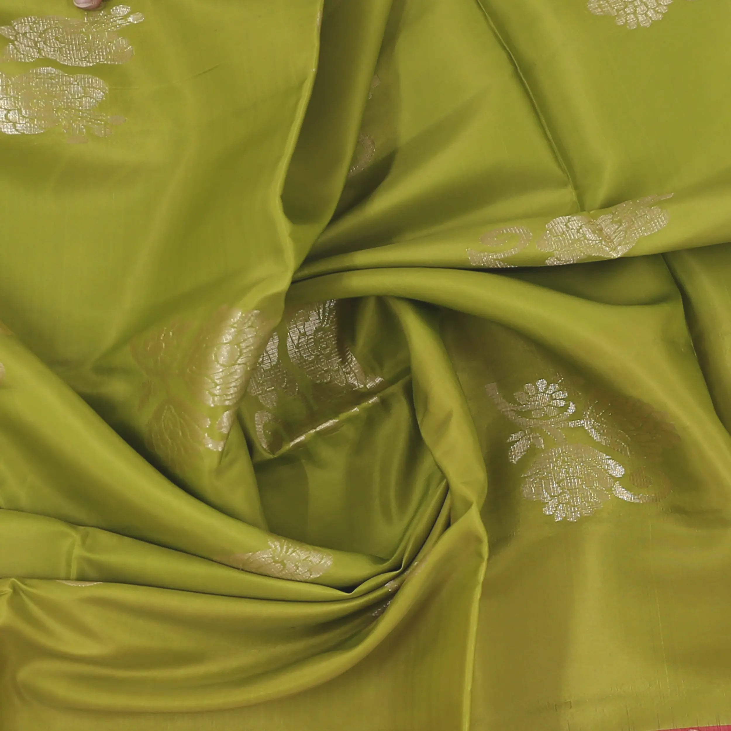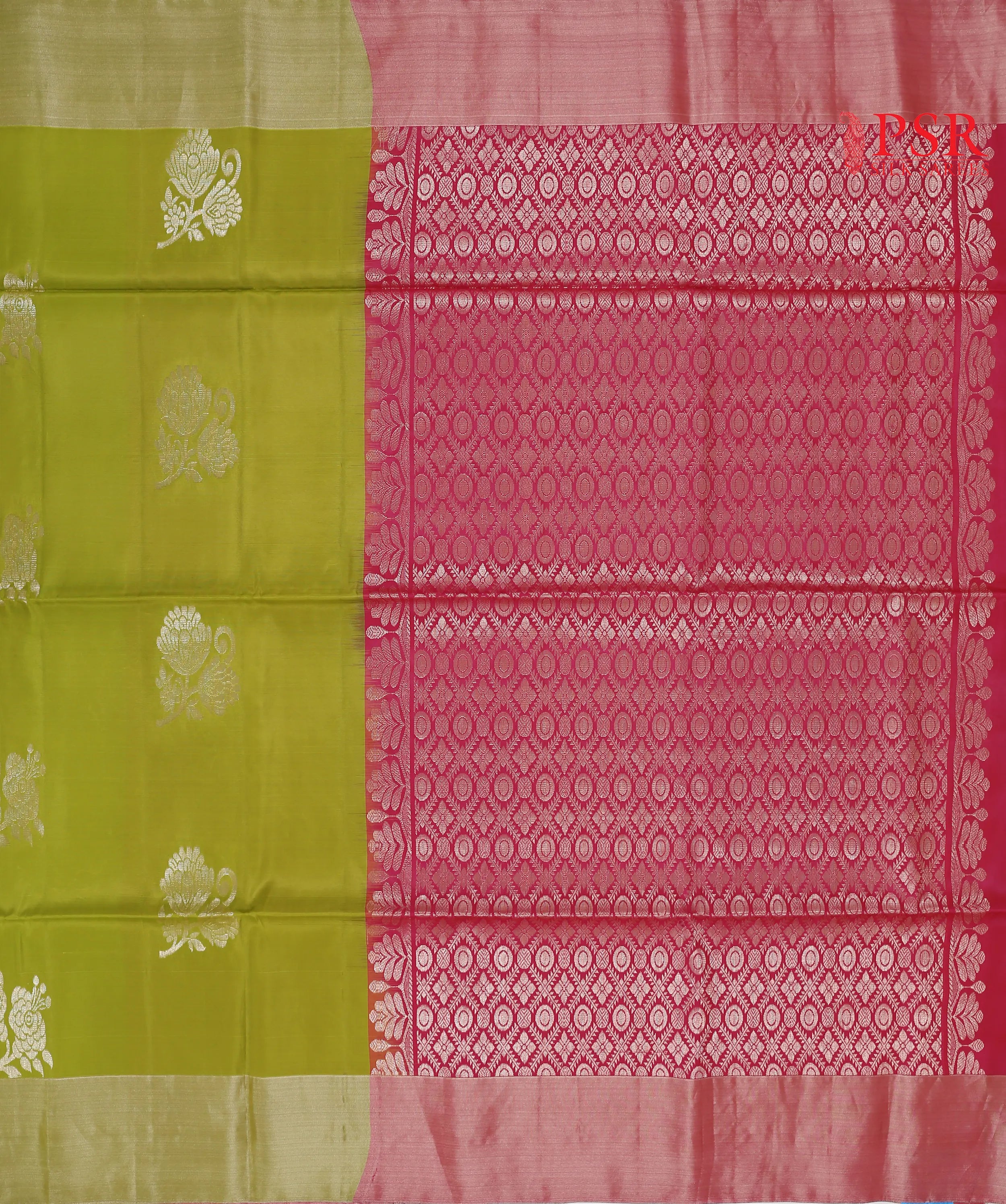 PSR Silk Sarees presents a Pear Green colored Soft Silk saree with combination of Dark Pink color.