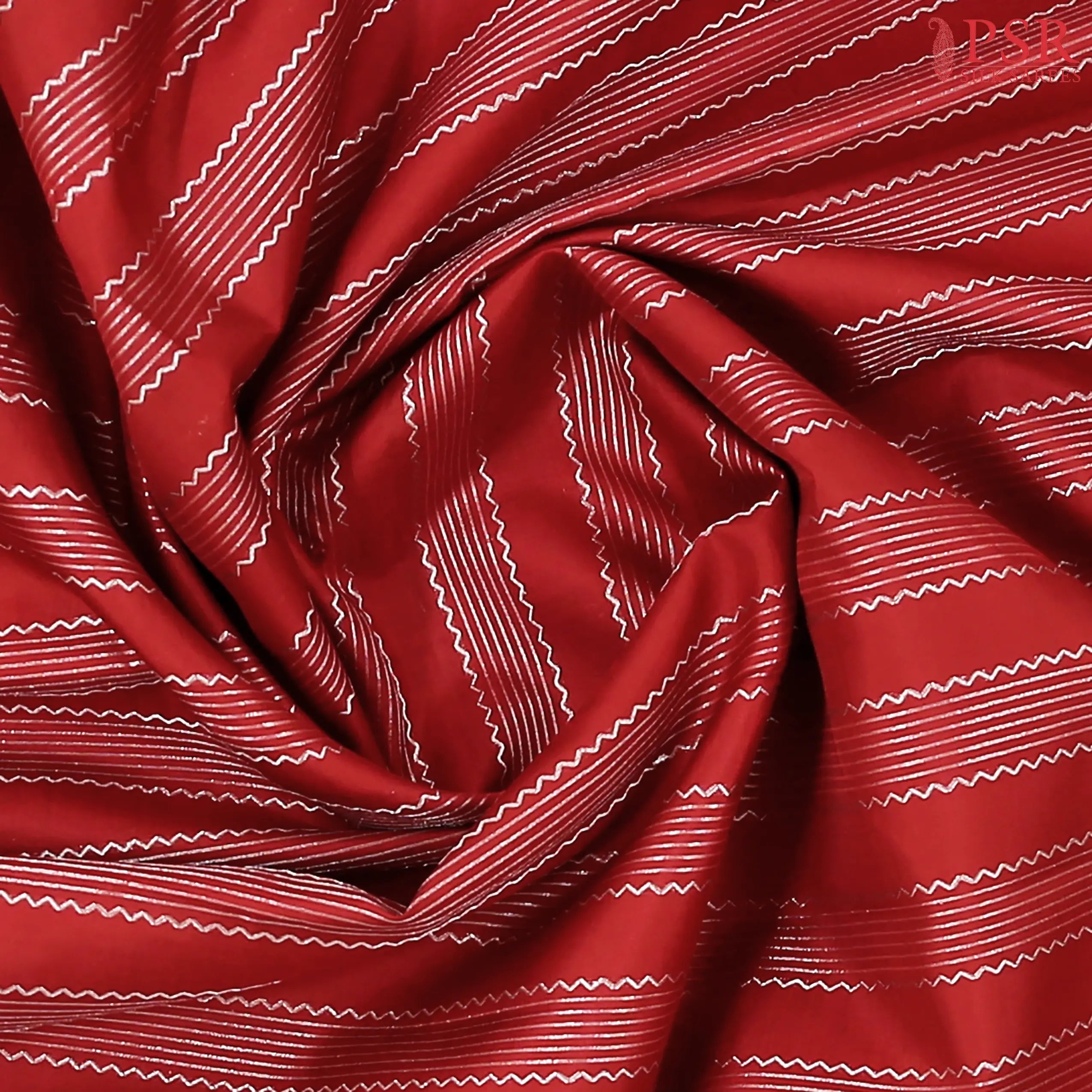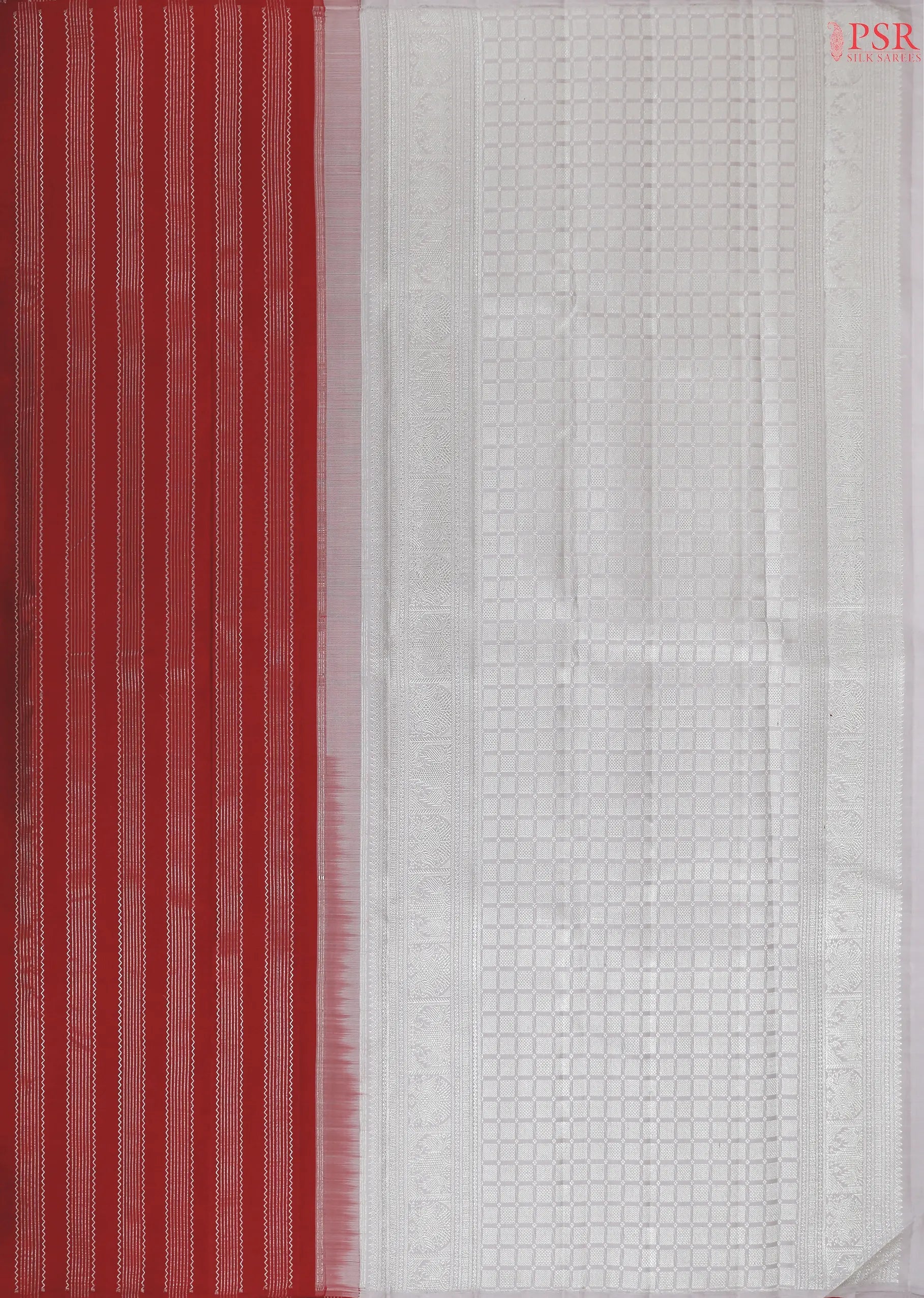 Unveil your elegant side with this RedĀ Kanchipuram Silk Saree from the Smartika Kanjivaram collection by PSR Silk Sarees. Crafted to exude modern grace, this borderless saree showcases subtle silver zari stripesĀ across its body, giving it a refined shimmer. It is paired with a Pale Lavender colored silver zari rich & traditional pallu and a Pale LavenderĀ zari work blouse, creating a stunning contrast that blends tradition with contemporary sophistication. Perfect for weddings, receptions, and graceful evening affairs.