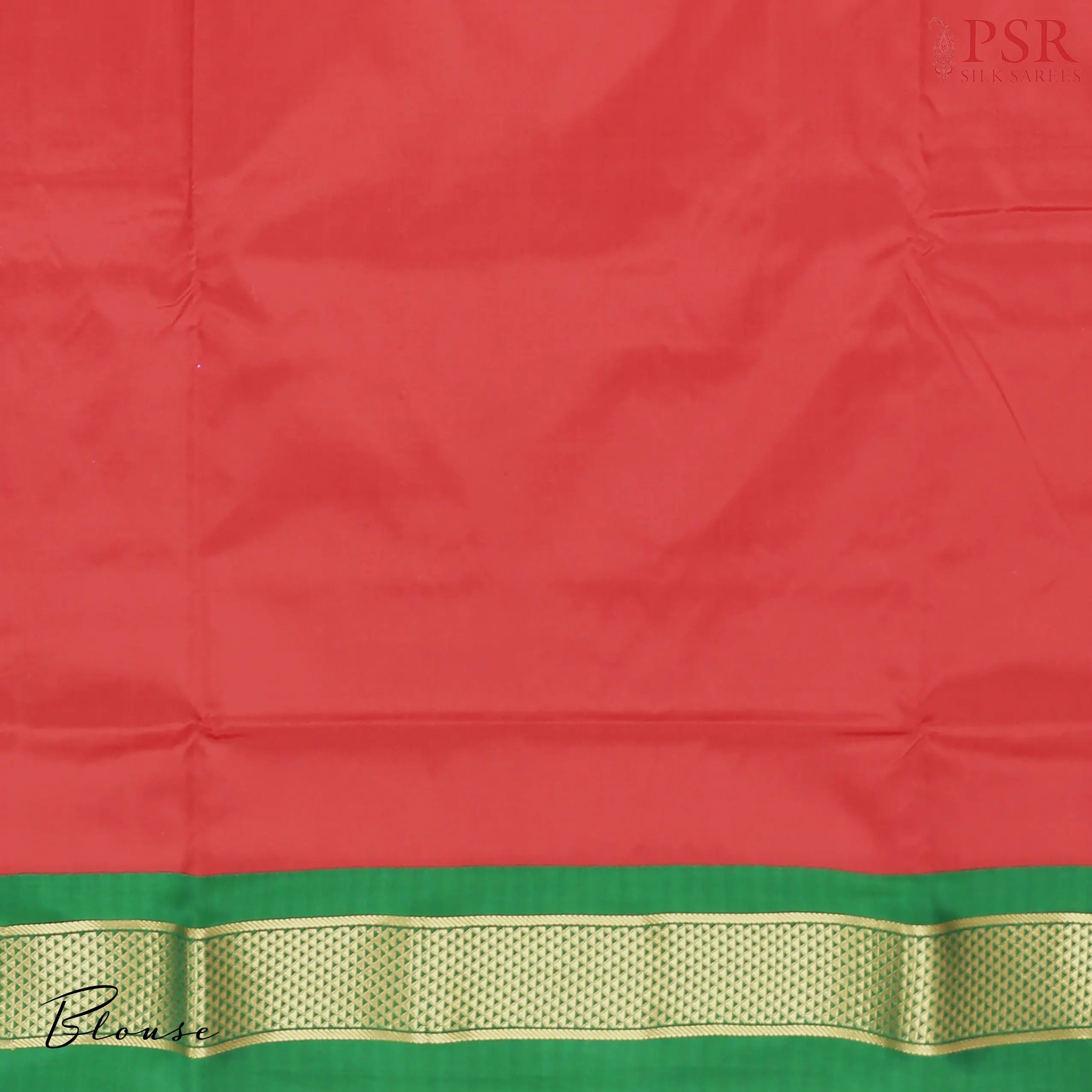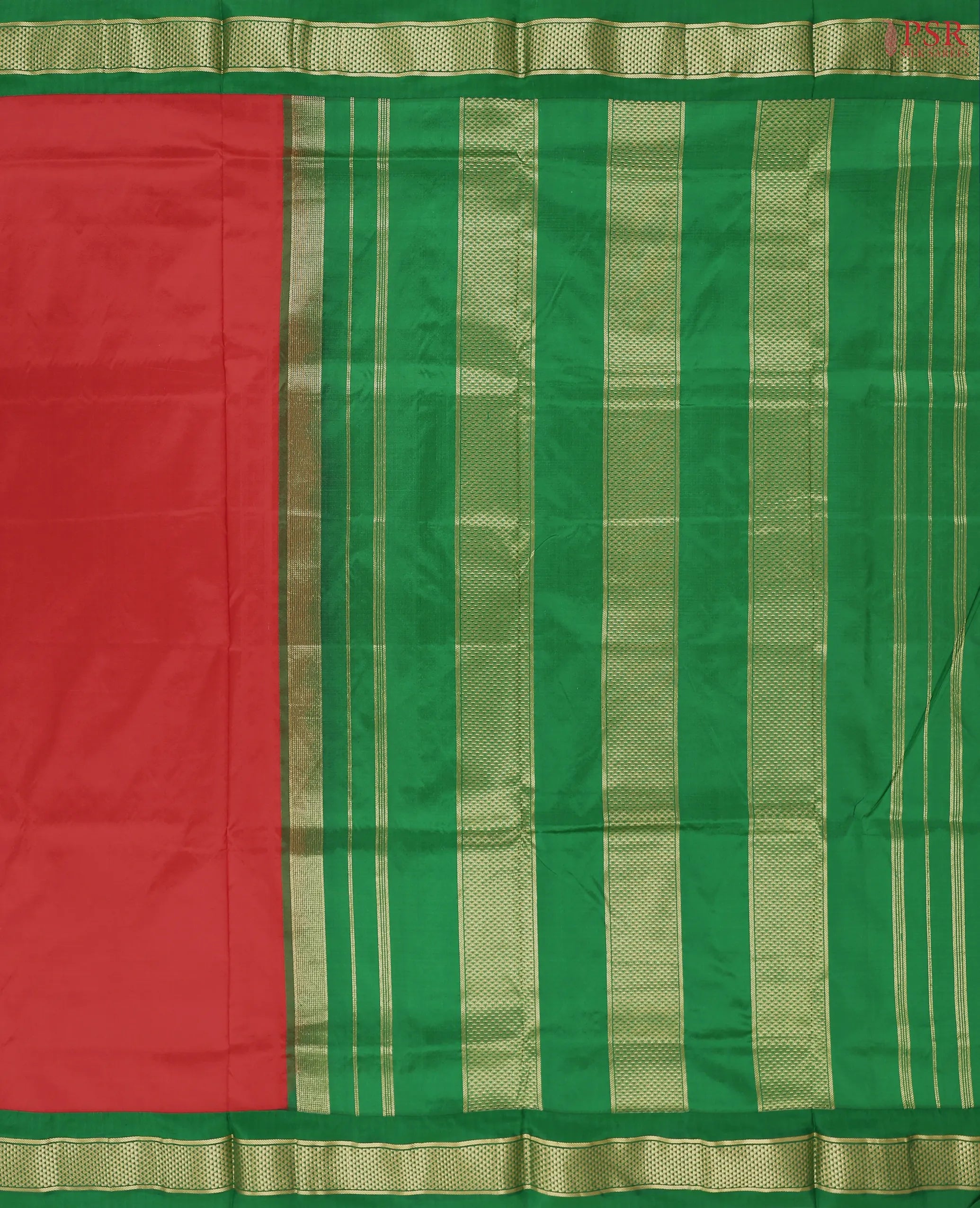 Celebrate heritage with our Red 9-Yard Kanchipuram Silk Saree, a symbol of grace and tradition. This exquisite saree, also known as “Madisar,” “Nauvari,” “Kashta,” and “Brahmni”, carries the essence of age-old customs, making it a perfect choice for sacred rituals, weddings, and cultural celebrations. The saree features a rich Emerald Green zari chit pallu, beautifully paired with a Korvai border, adding a regal touch to its grandeur.