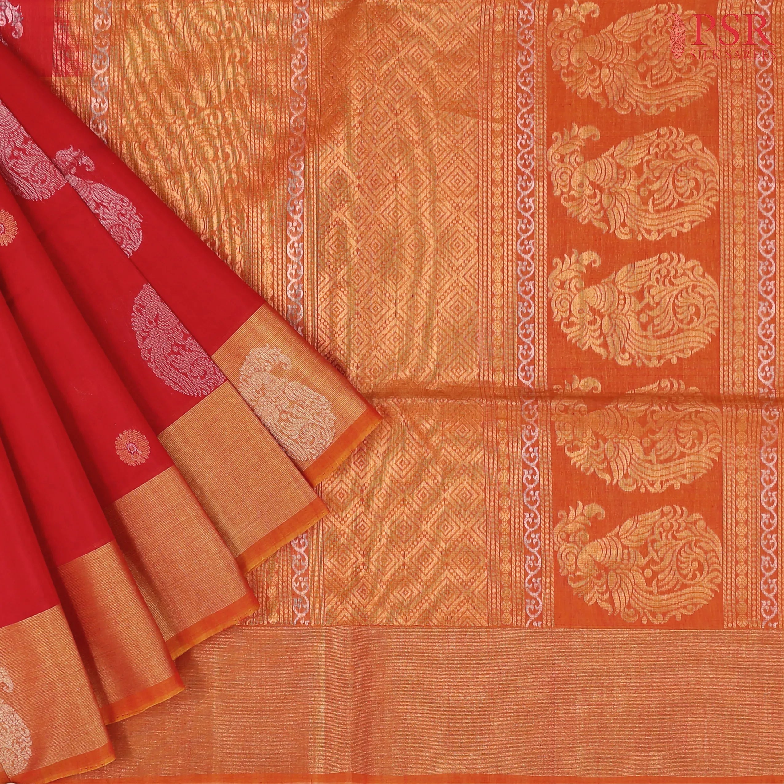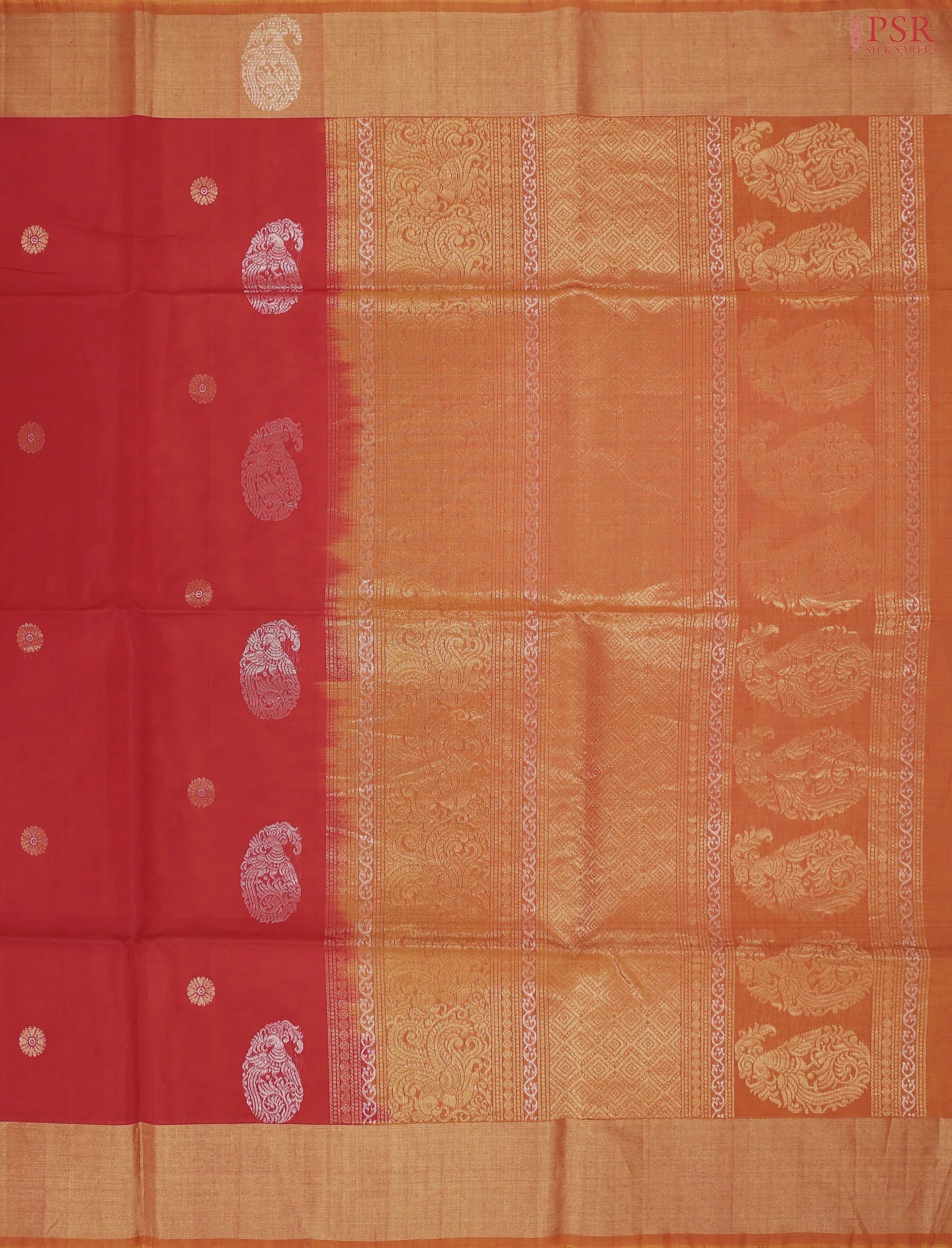 PSR Silk Sarees presents a Red colored Silk Cotton saree with contrasting combination of Orange color.