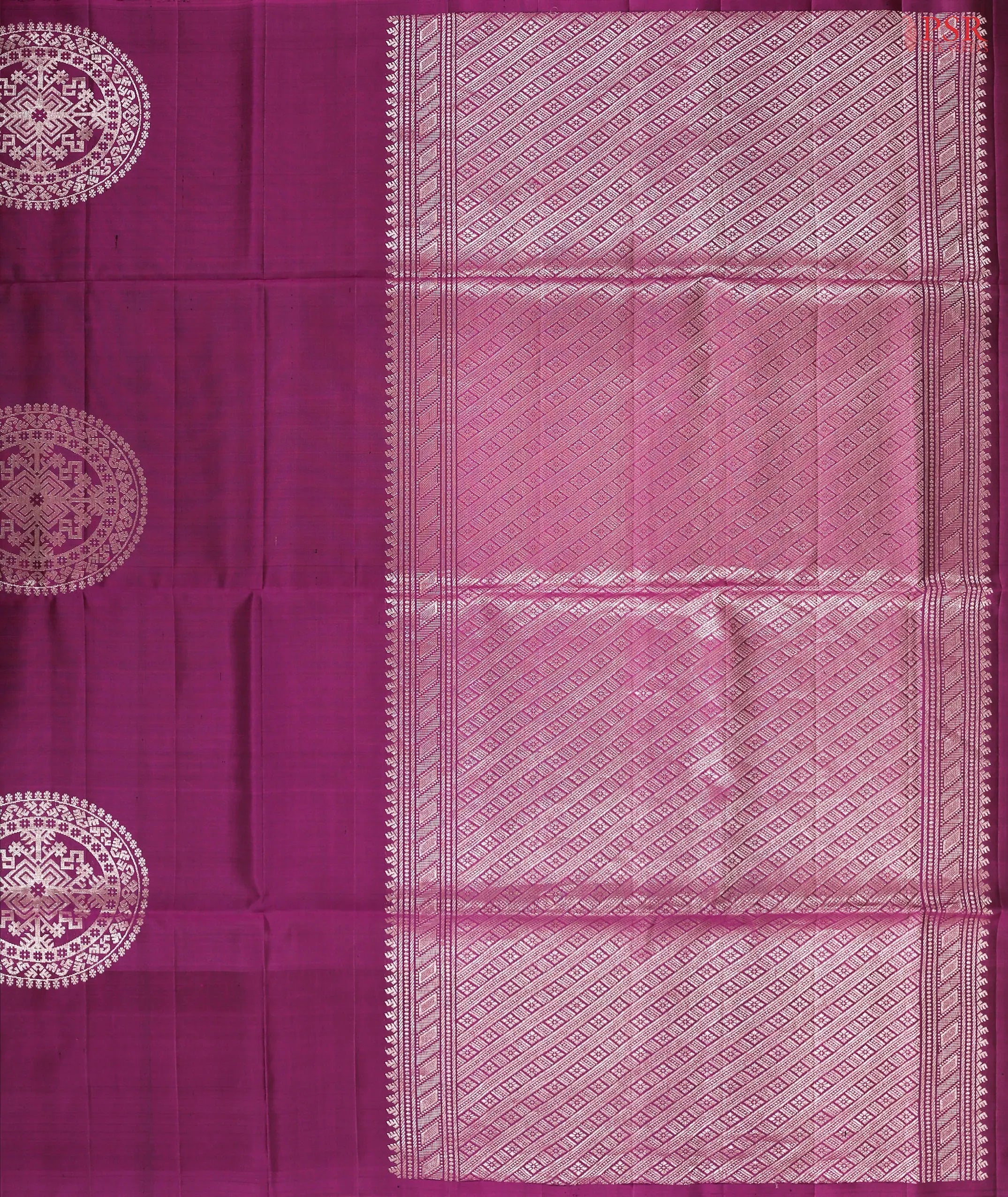 Celebrate timeless beauty with our Sangria Purple Soft Silk Saree. The saree features bold floral chakra motifs intricately woven in silver zari, creating a captivating design. Its borderless silhouette enhances its modern appeal, while the traditional zari pallu work adds a touch of tradition. The plain blouse completes this refined look, offering a perfect balance of style and elegance.