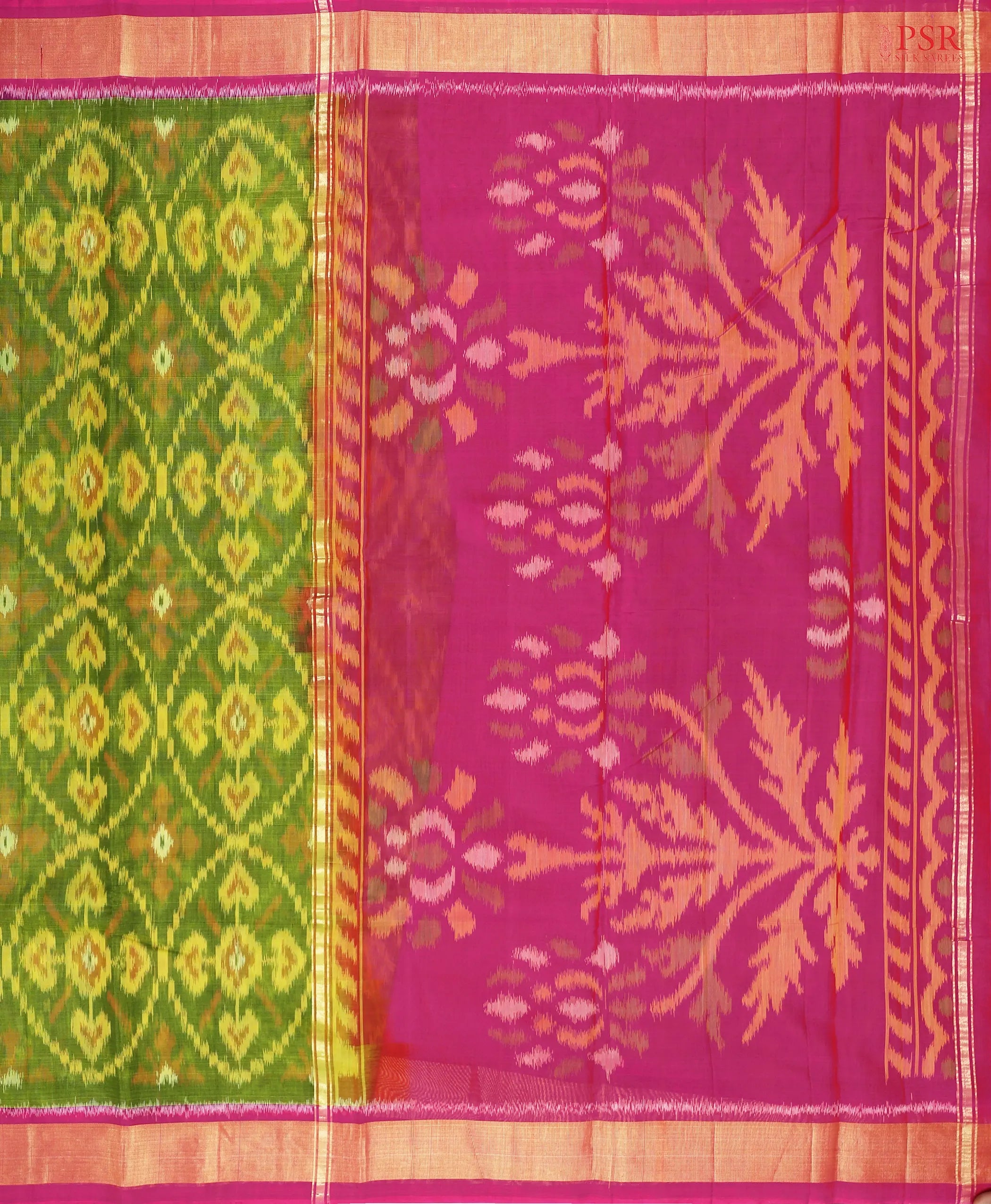 PSR Silks Presents: Sap Green & Magenta Pink Patola Pochampally Silk Cotton Saree – A Fusion of Tradition & Elegance