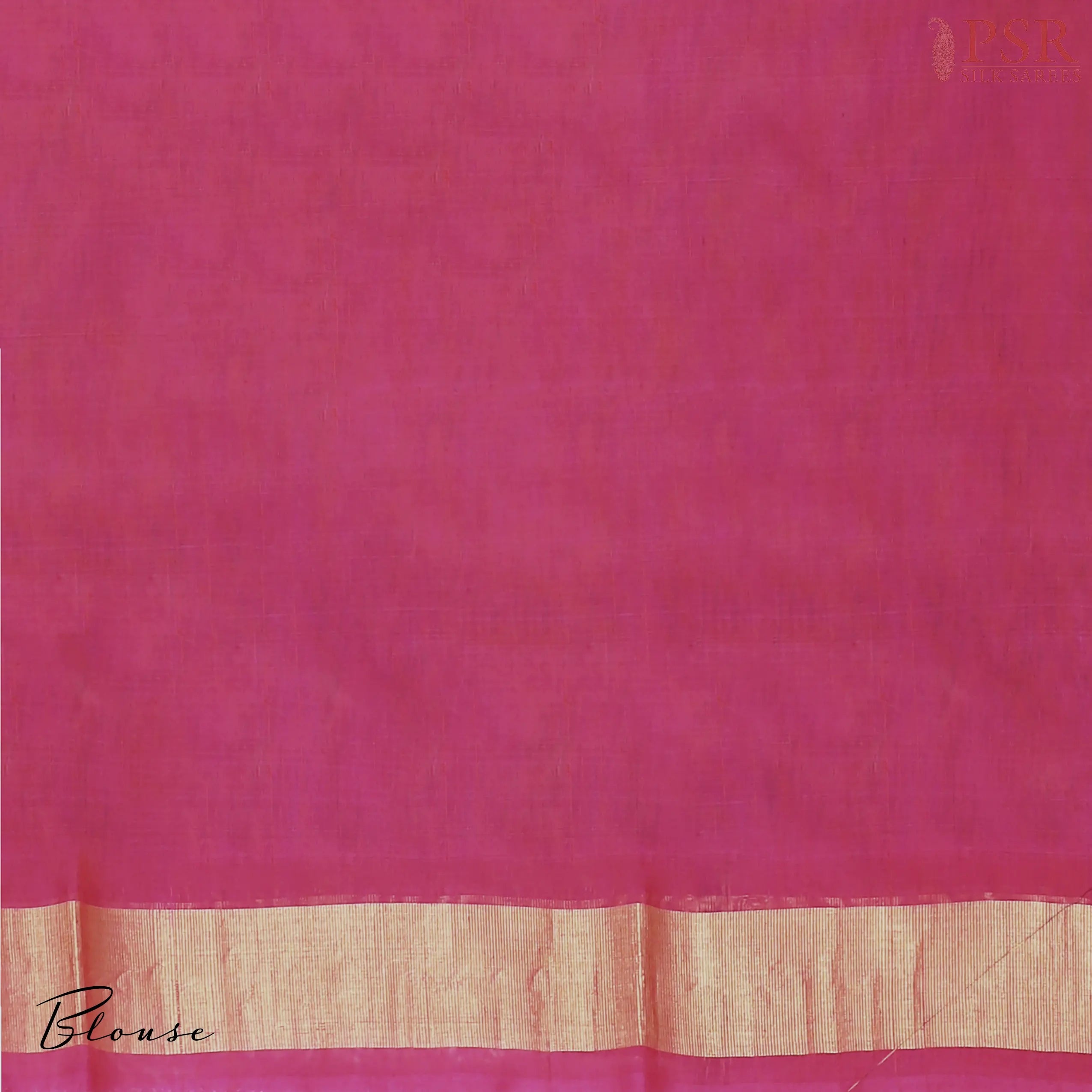 Drape yourself in heritage with this Sap Green Patola Pochampally Silk Cotton Saree, adorned with intricate Ikkat Pochampally patterns. The contrasting Magenta Pink-hued pallu, enriched with fine Pochampally motifs, adds a refined touch. Paired with a plain blouse and finished with a delicate tissue border, this saree exudes timeless grace.