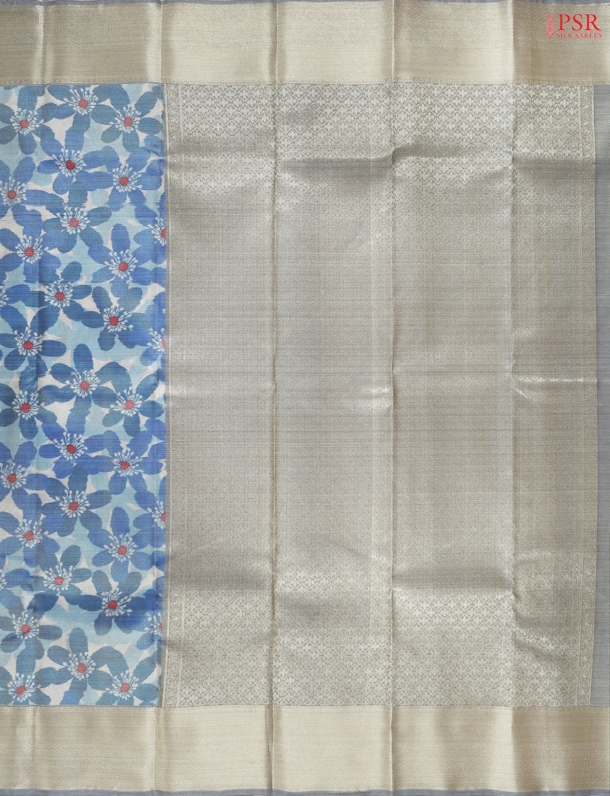 PSR Silk Sarees presents a Steel Blue Printed Tissue Art Silk Saree with combination of Fossil Grey color.