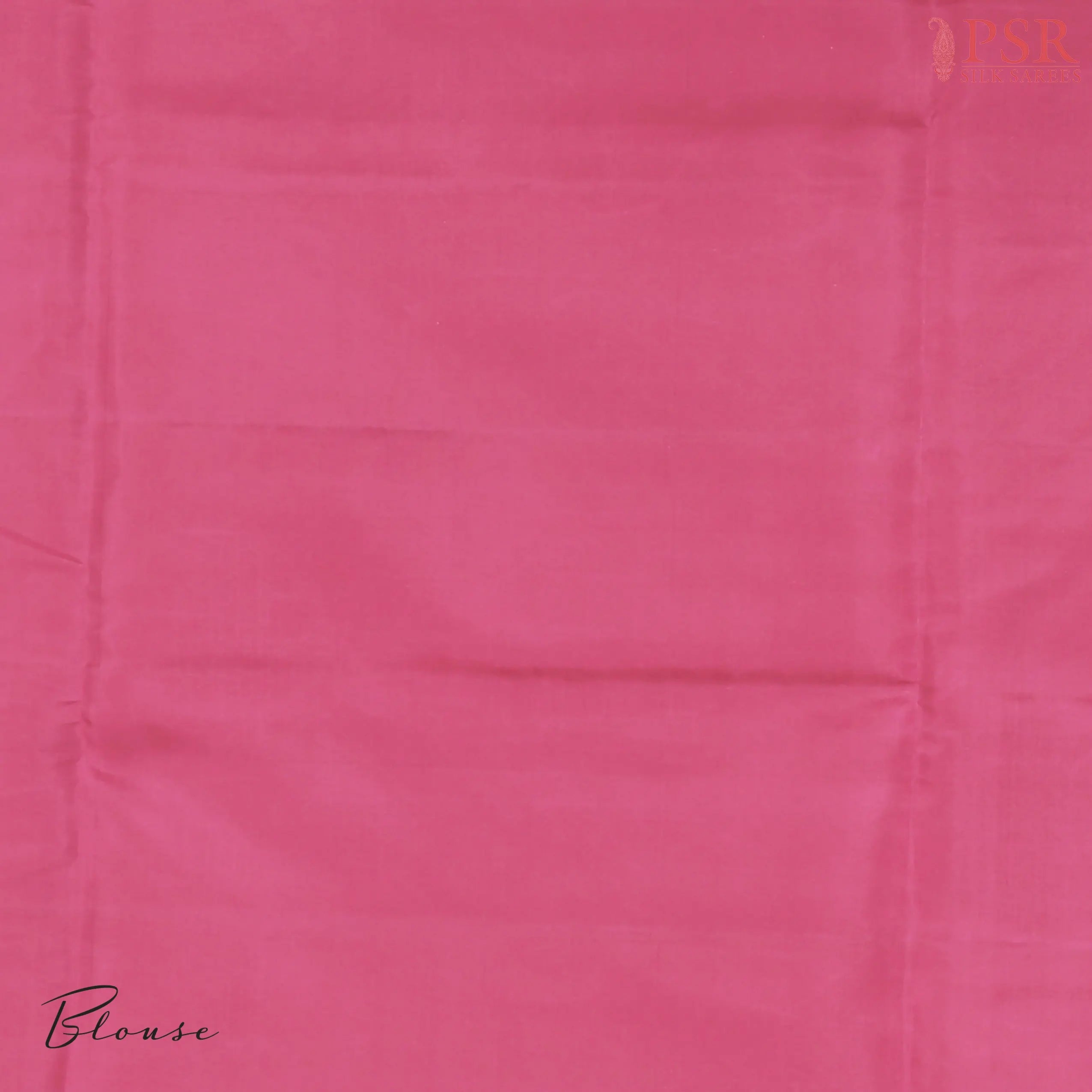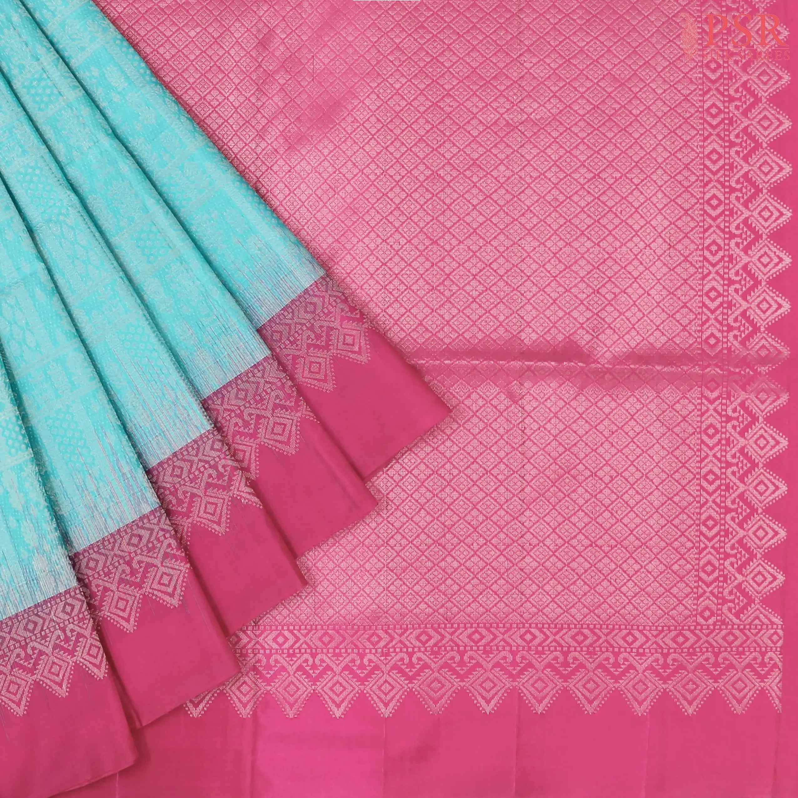 PSR Silk Sarees presents a Turquoise Blue colored Soft Silk saree, paired with a contrasting Persian Pink combination. The saree is enhanced with an elegant zari jacquard weaves. Completing the look, the saree comes with a Persian Pink pallu and border woven in traditional silver zari work, along with a plain Persian Pink blouse.