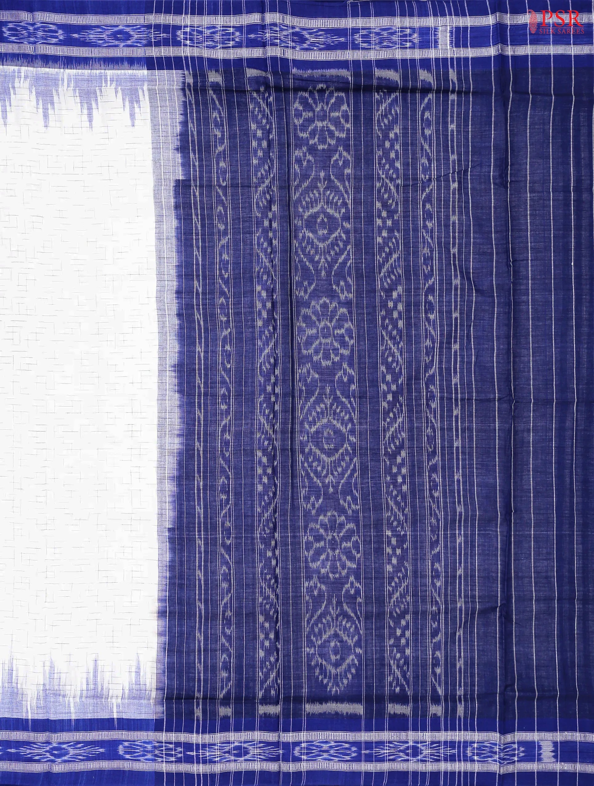 PSR Silk Sarees presents a White colored Ikkat cotton saree with combination of Navy Blue color.